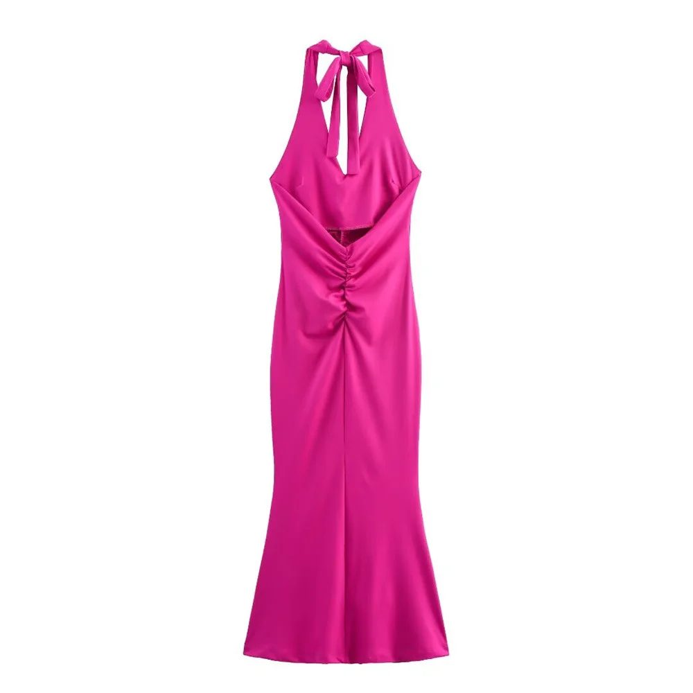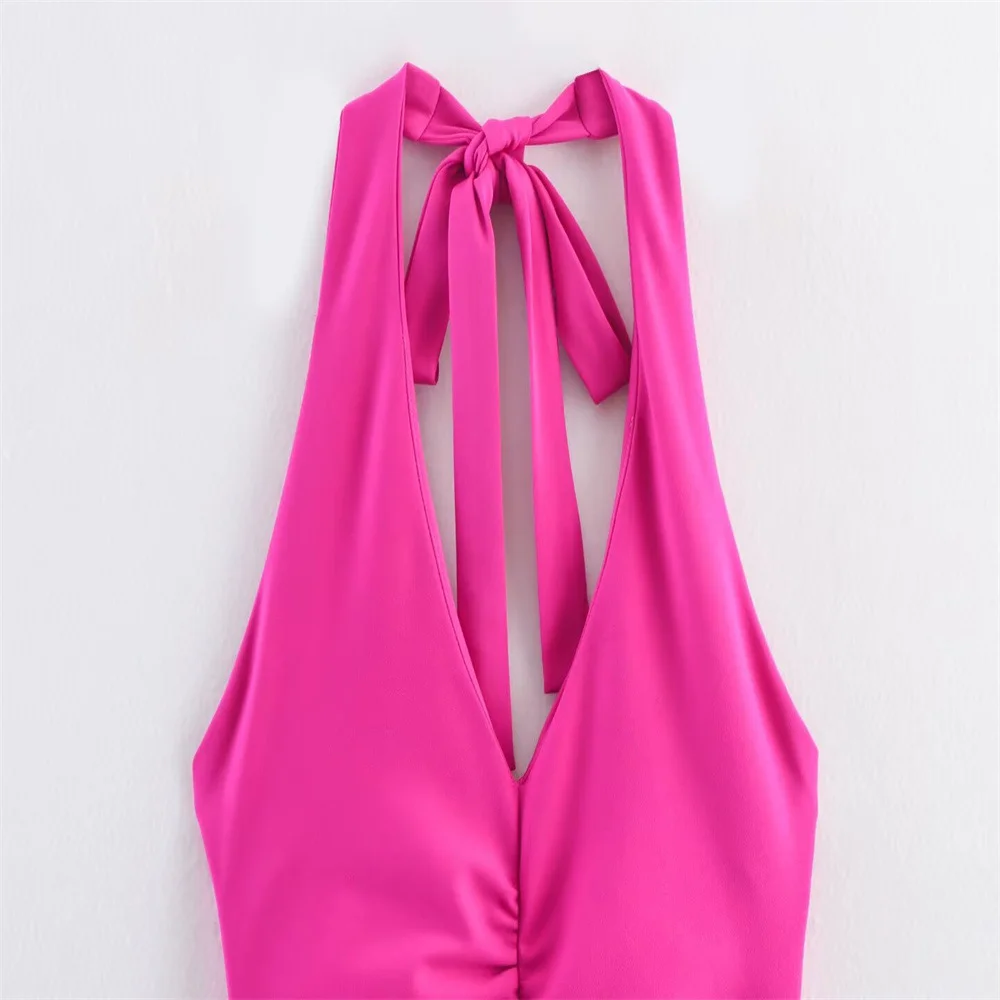 Women's 2026 Summer Solid Color Backless Pleated Dress with Breathable Polyester/Cotton Fabric for Daily Vacation Wear