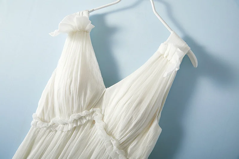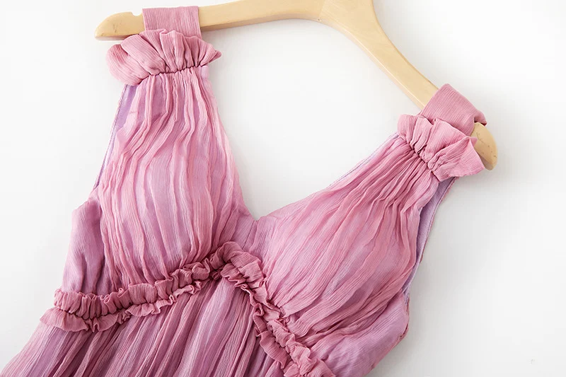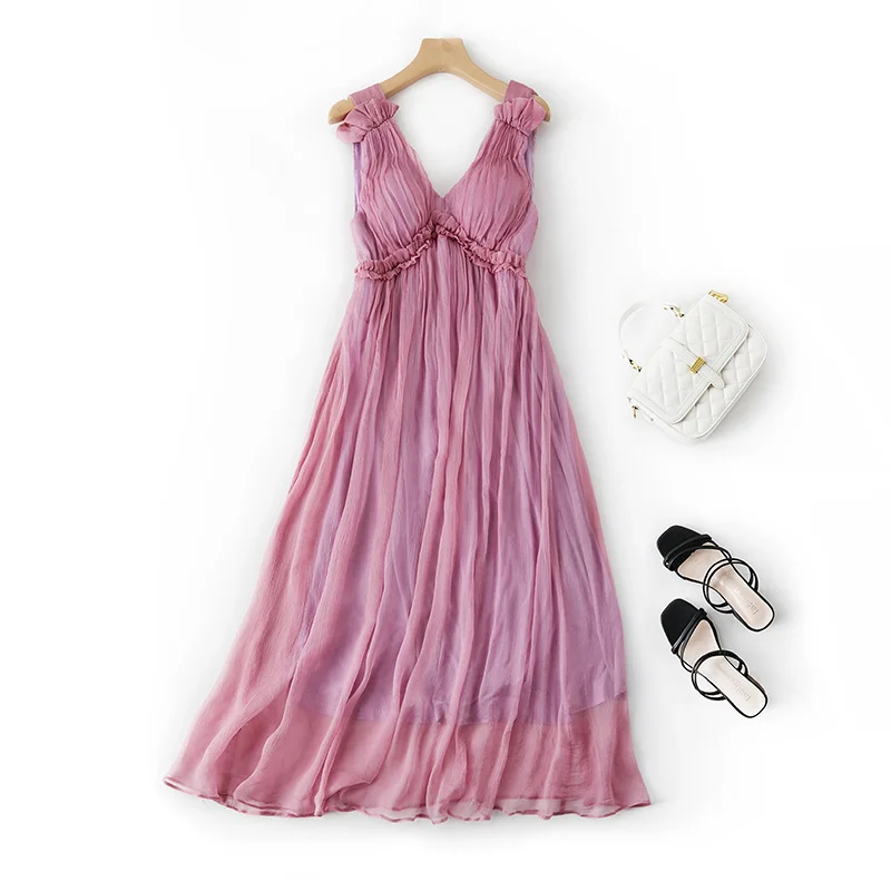Wholesale Natural Silk Female Sleeveless V Neck Solid Ruffle High Waist Loose Maxi Tank for Summer Casual Floor-Length