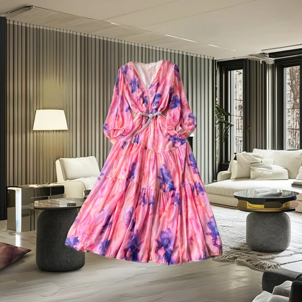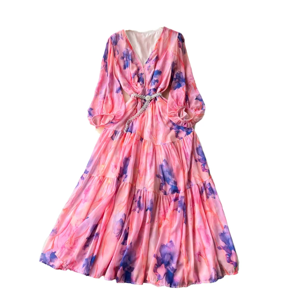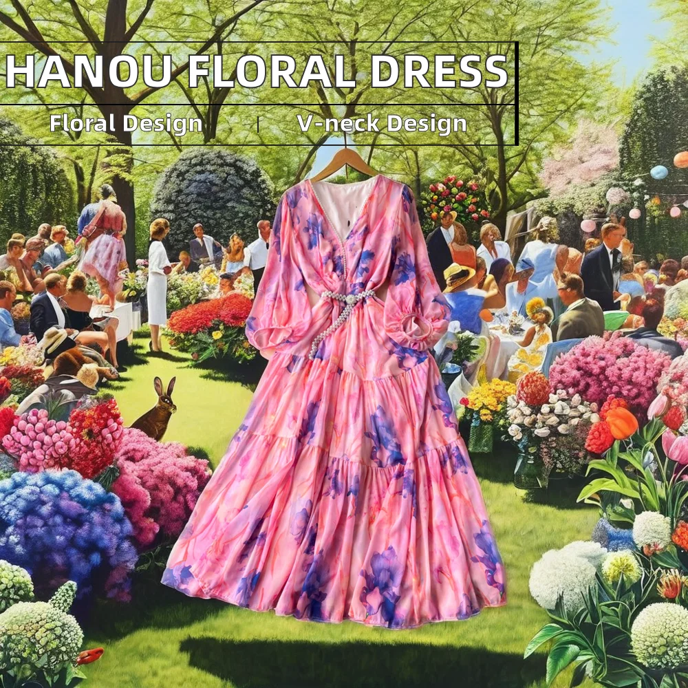 Women's Ethnic Beaded V-Neck Printed Dress Elegant Long Floral Dress Temperament Lantern Long Sleeve for Day Office Lady