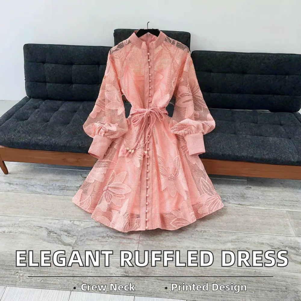 Solid Color Elegant Long-Sleeved Casual Dress Ruffles Casual Daily Dress for Spring Button Decoration Digital Printing Nonwoven