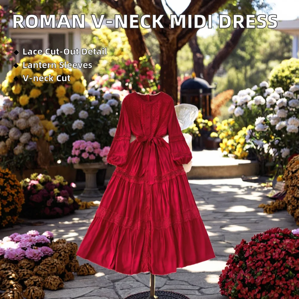 Summer Women's Roman V-Neck Tunic Casual Midi Dress Lantern Sleeves Empire Hollow Lace Dress Solid Pattern Front Sustainable
