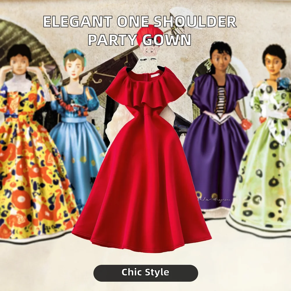 Women's Elegant One-Shoulder Ruffle Gown for Summer Dinner Parties Office Lady Style Breathable Washable Midi-Length Long Dress