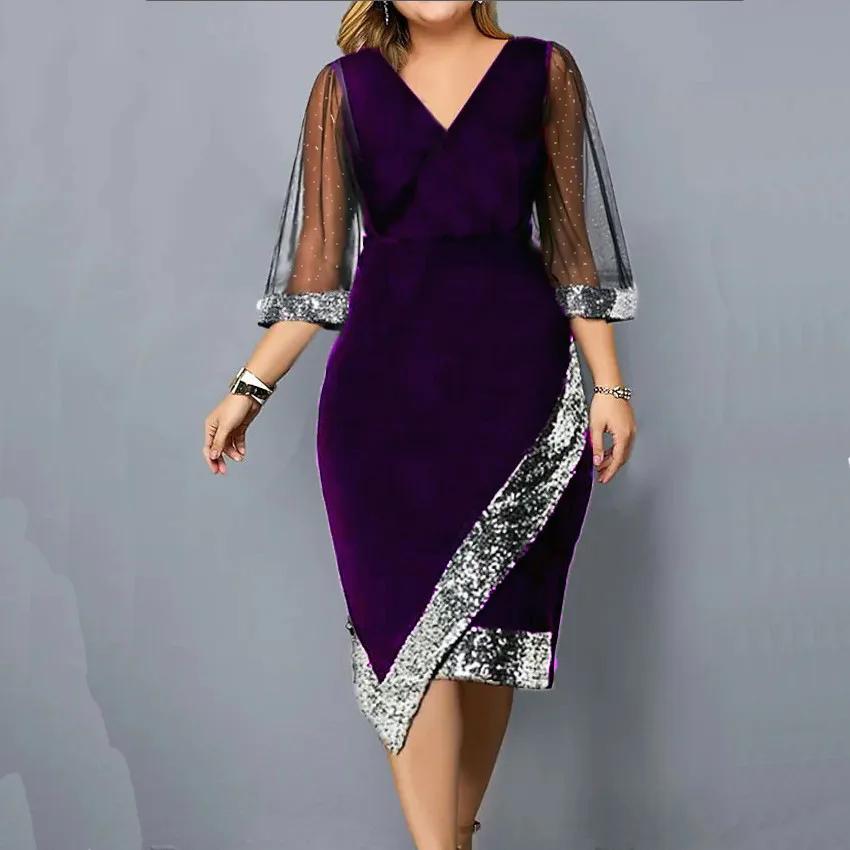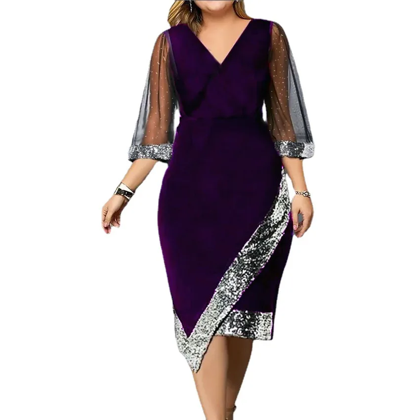 Summer Fashion Elegant Irregular Sequins Mesh Casual Dress for Women Sleeve V-neck Plus Size Women Party Casual Dress
