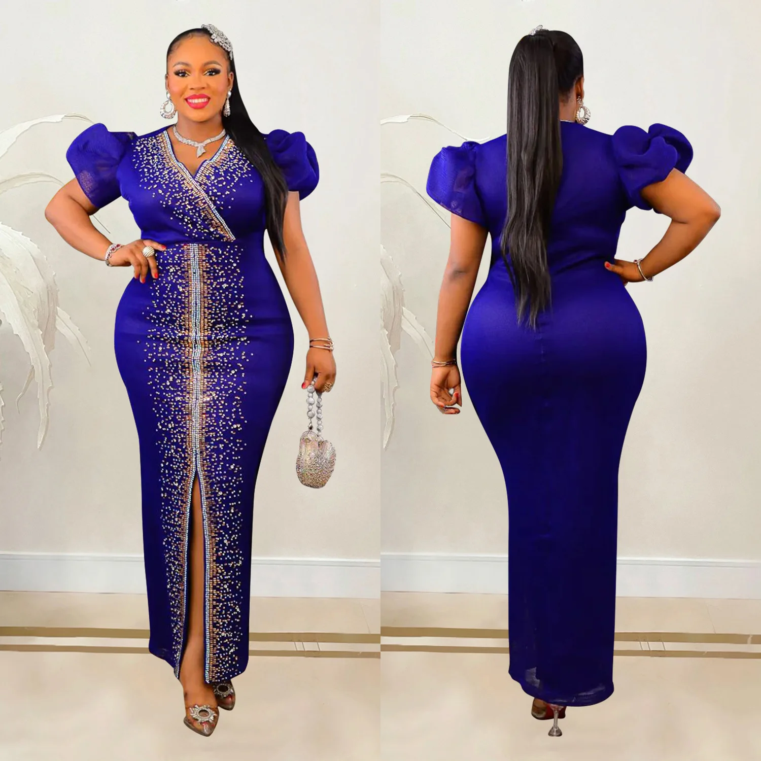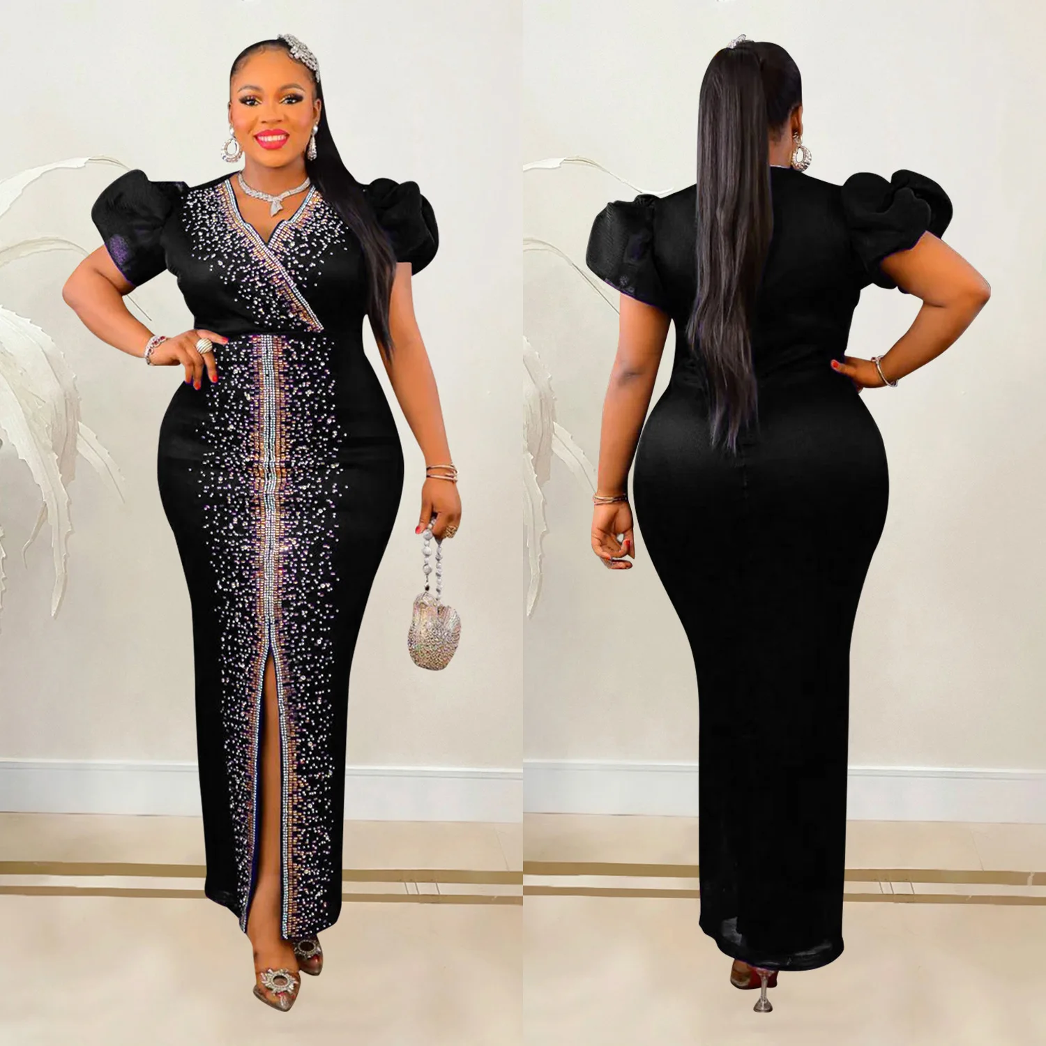 Pleated Puff Sleeve Stretch V-Neck Rhinestone Beaded Long Gown Elegant Party Dress Luxury Women's Evening Dresses