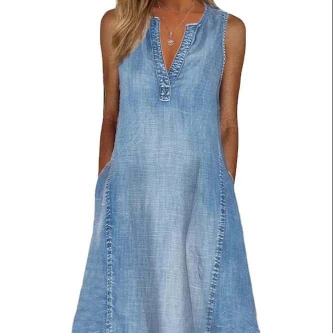 Summer XL Size Casual Dress European American Style V-Neck Sleeveless Loose Fit Floor-Length Denim Unique Patterns Solid Color