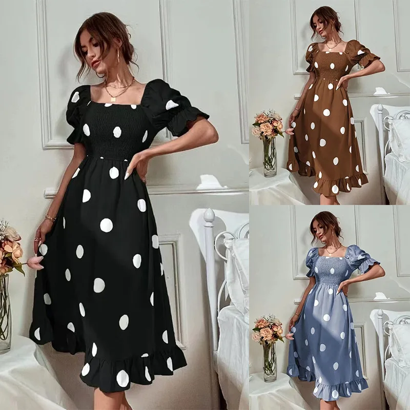 Women's Polka Dot Sweet Ruffle Short Sleeved Large Hem Dress in Stock