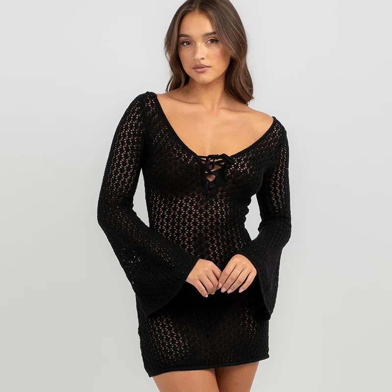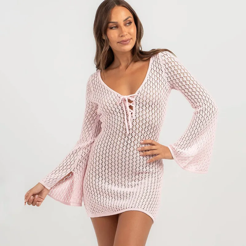High Quality Summer Fashion Bikini Cover up Dress Long Sleeve Swimwear Swimsuit Cover Ups Knitted Long Sleeve Beach Dresses