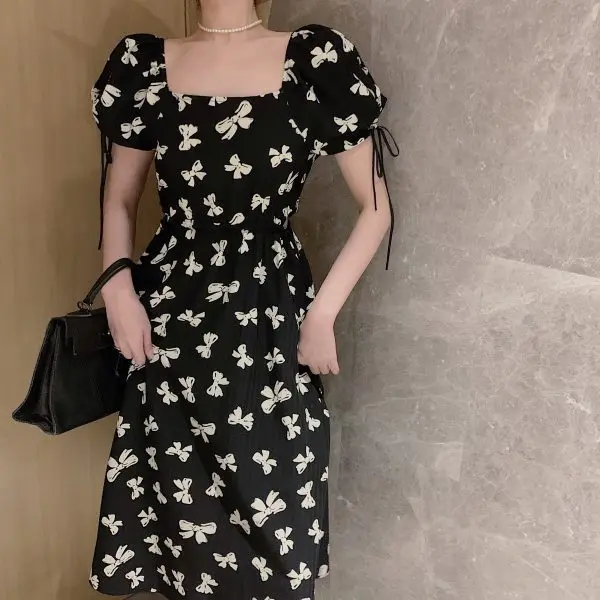 ZYHT 21938 Black Velvet Mini Dress Square Neck Long Puff Sleeves with Pearl Trim & Crystal Dess Flared Scalloped Hem Dresses