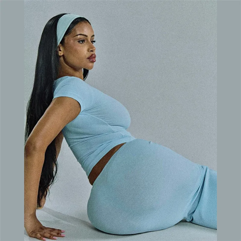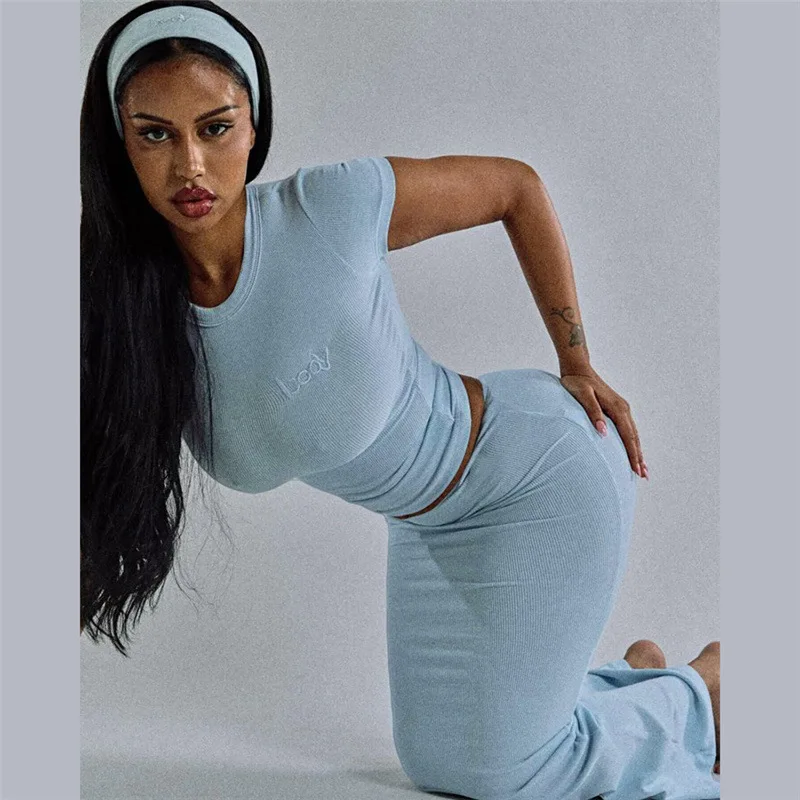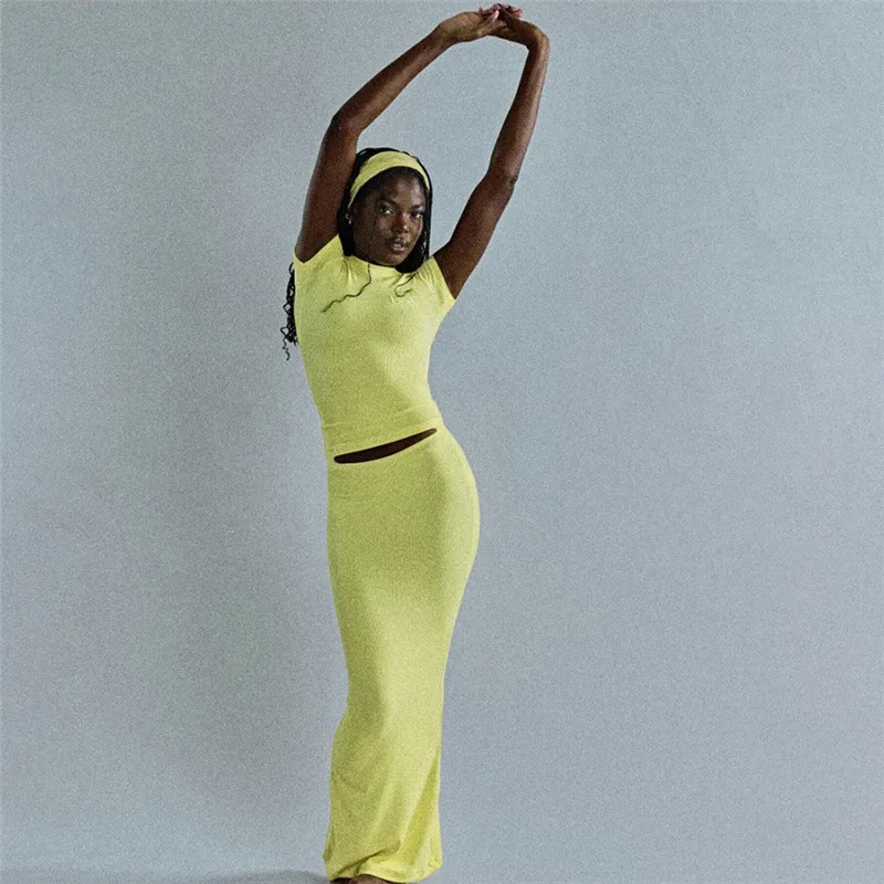 OEM Custom Classic Yellow Poly Spandex Ribbed Knit Short Sleeved Tshirt Long Maxi Skinny Skirt Two Pieces Casual Summer