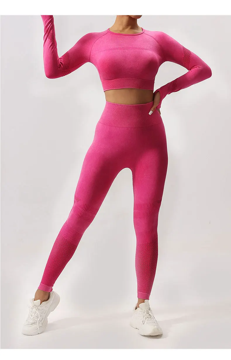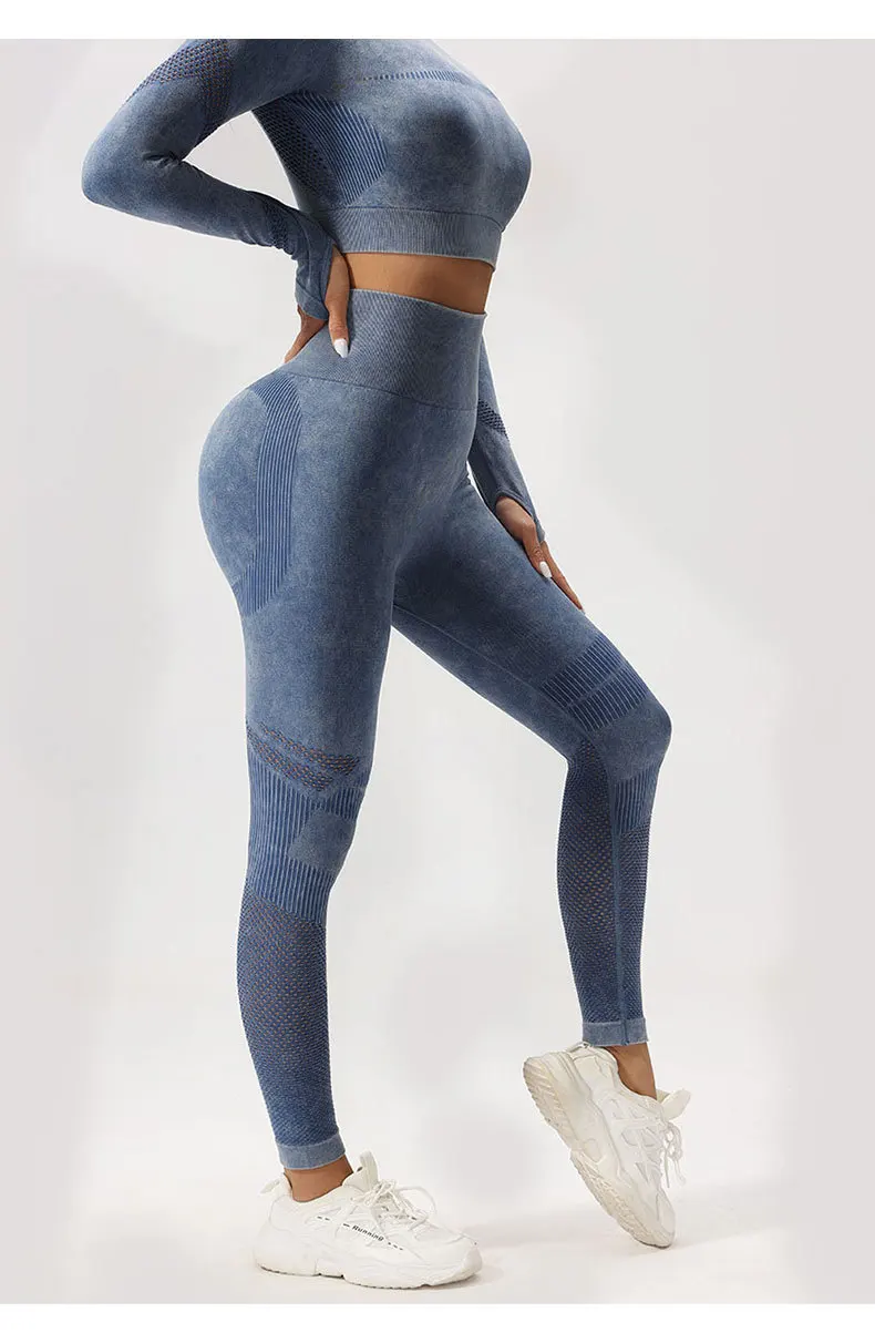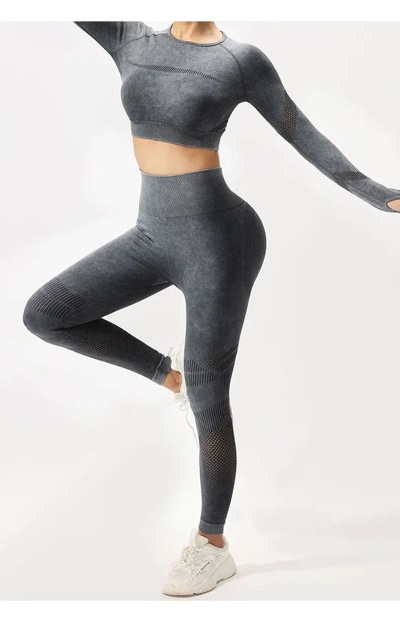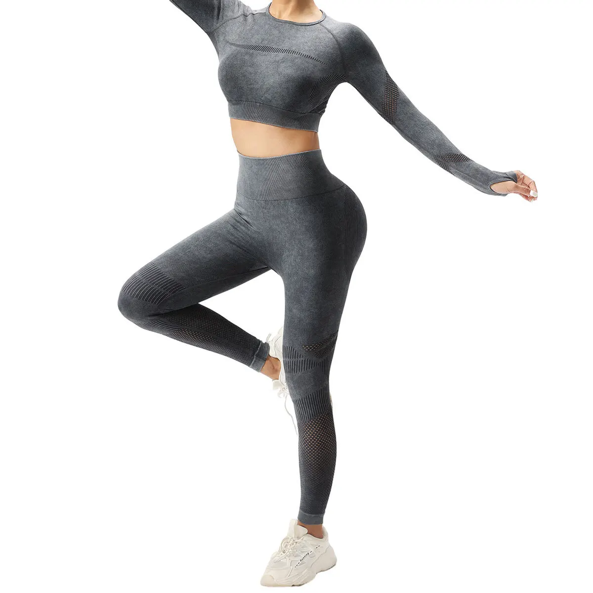 High Quality Seamless Women Athletic Wash Acid Fitness Long Sleeves Hollow Sexy Slim Leggings Breathable High Elastic Yoga Set