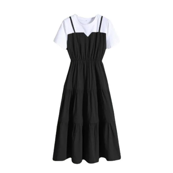 Wholesale New Fashion Women Short Sleeve Color Matching Dresses Summer Casual Patchwork O-neck Girls Sweet Hot Sale Dress