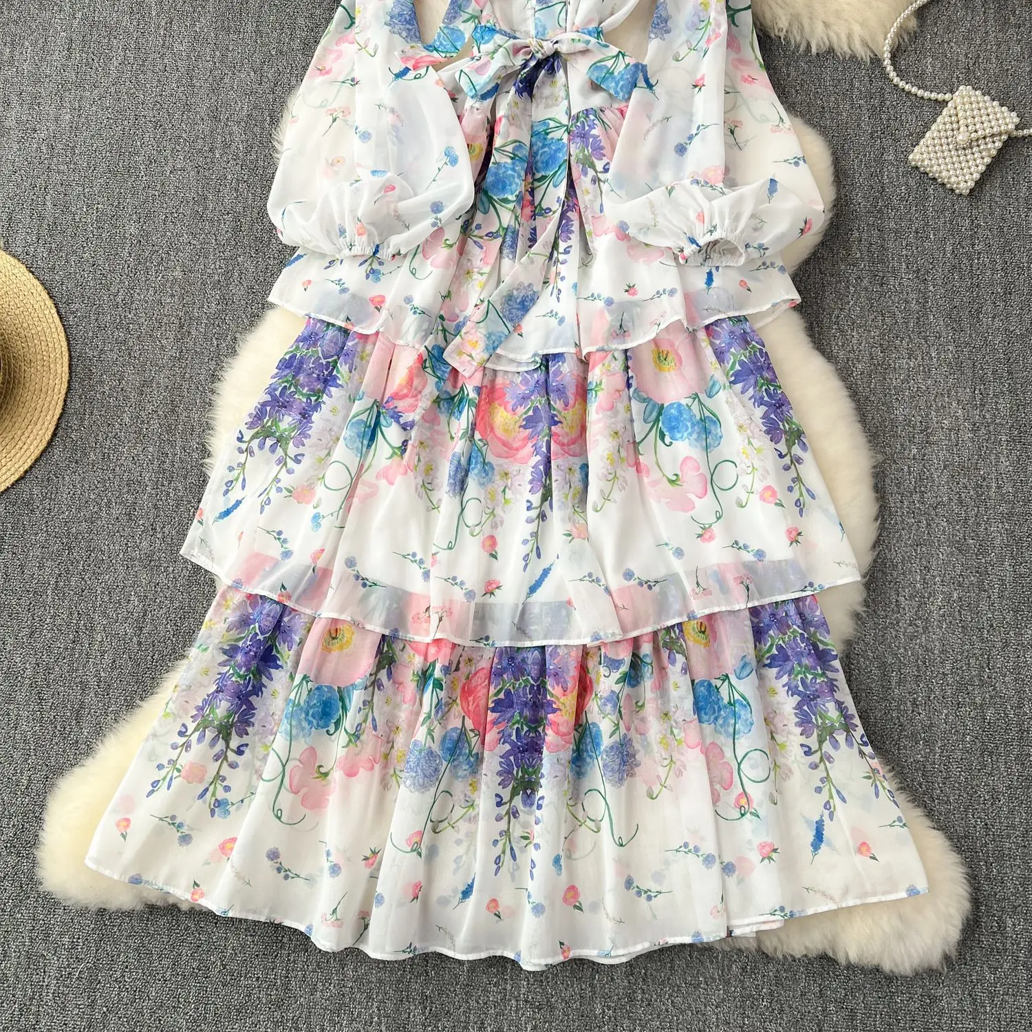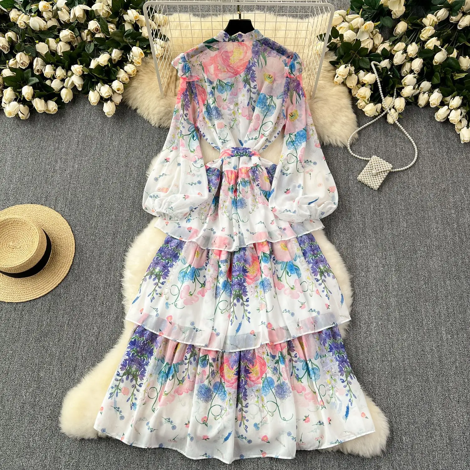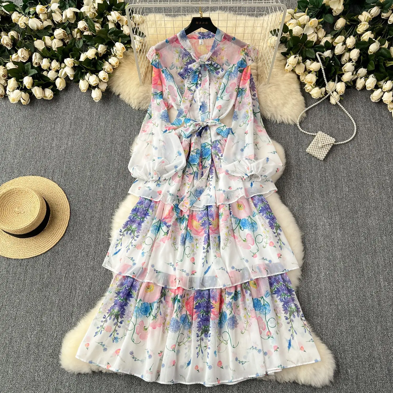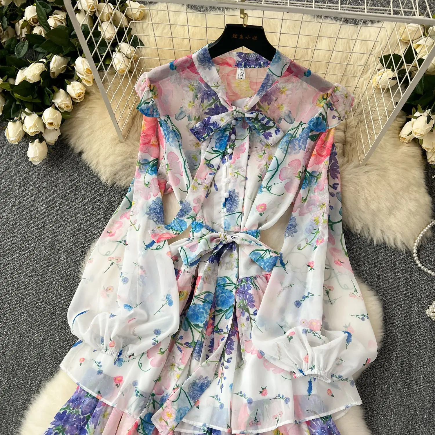 Retro Elegant Dress for Women Luxury Fashionable Printing Waist Binding Chiffon Floral Skirt Long Skirt