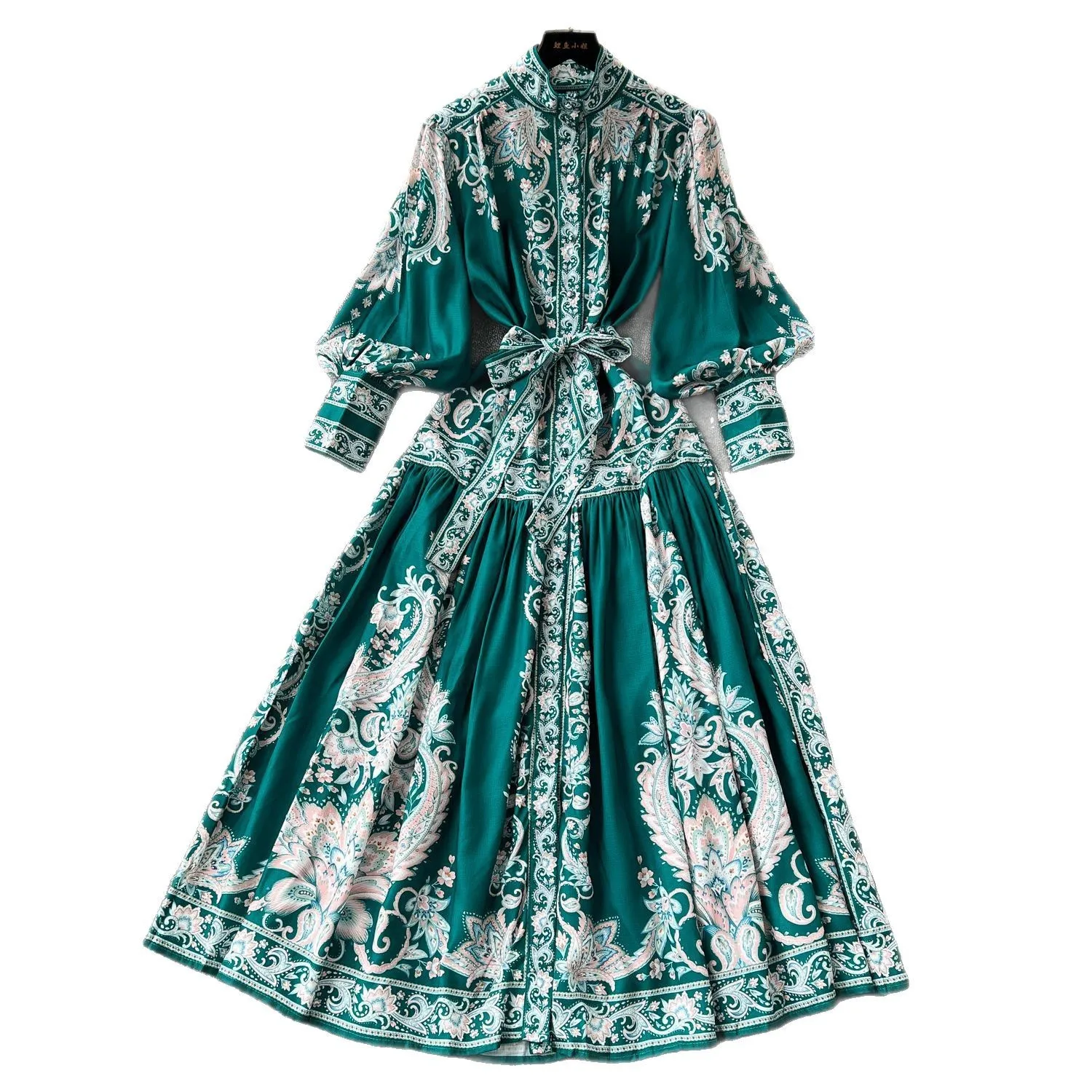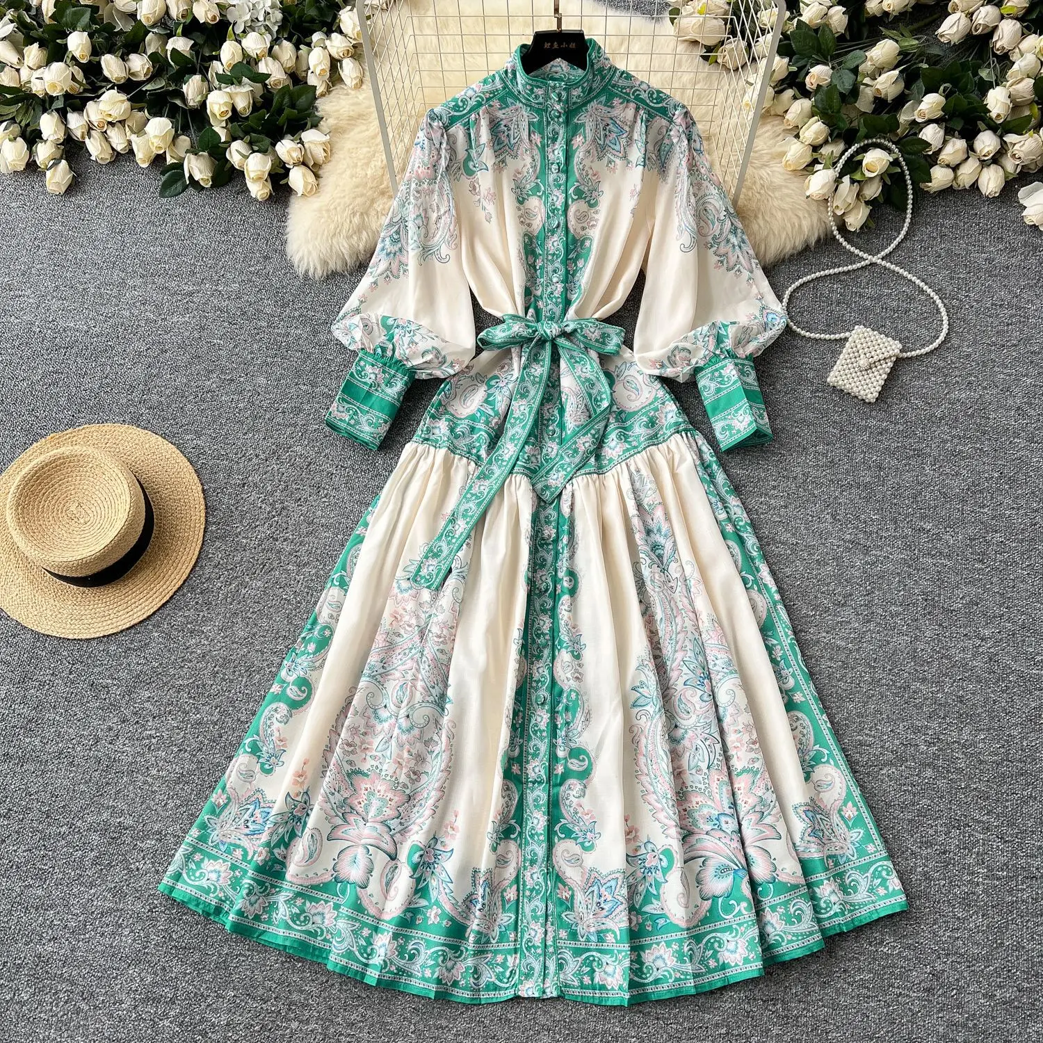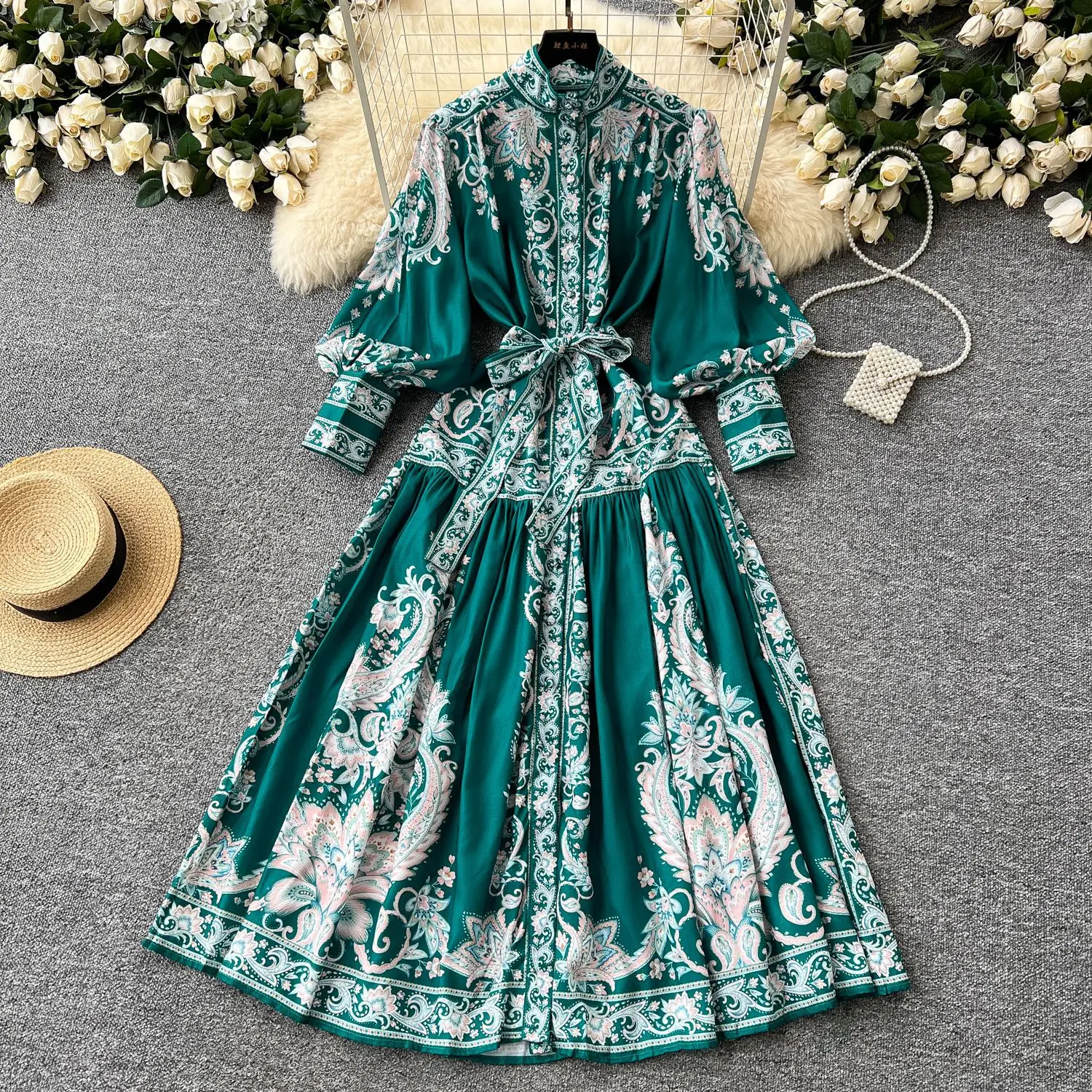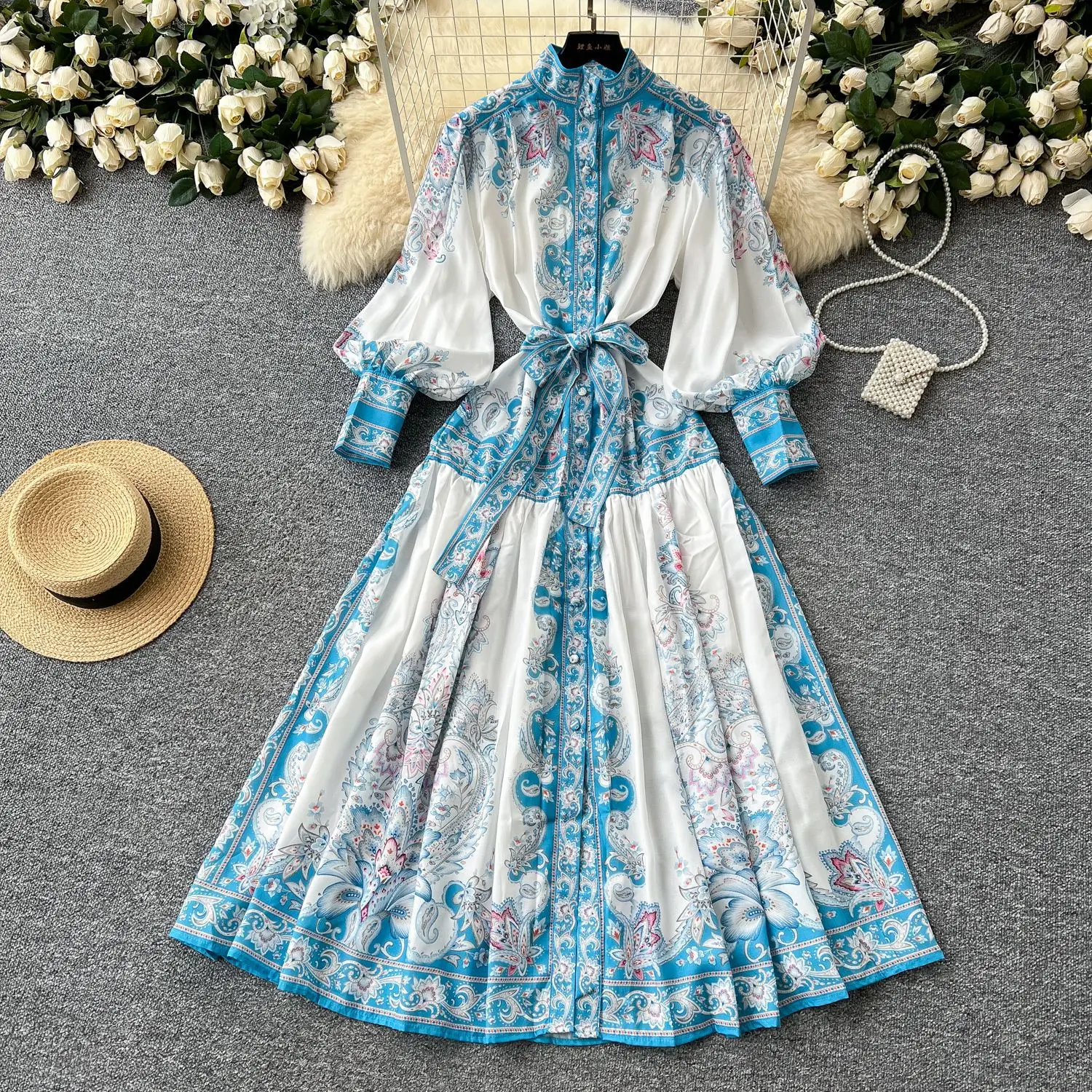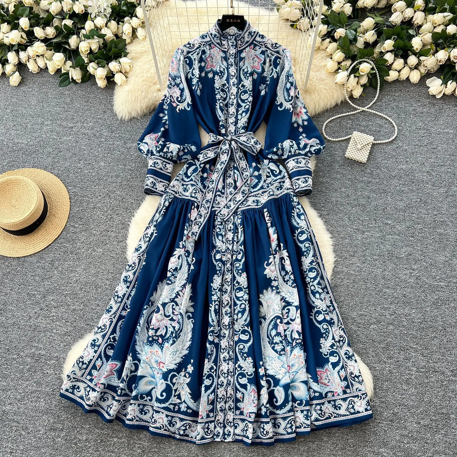 New Ethnic Stylish Long Sleeve Stand Collar Print Muslim Dress Women Vintage Dresses Clothing
