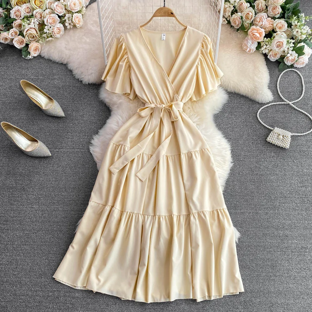 New Korean Design Solid Color Simple Match All Puff Sleeve Midi Dress Female Casual Dresses