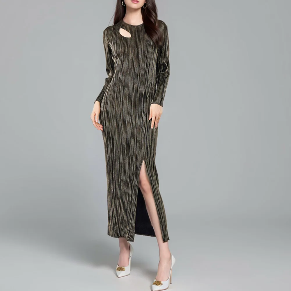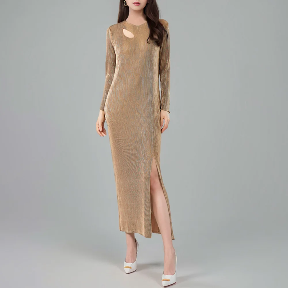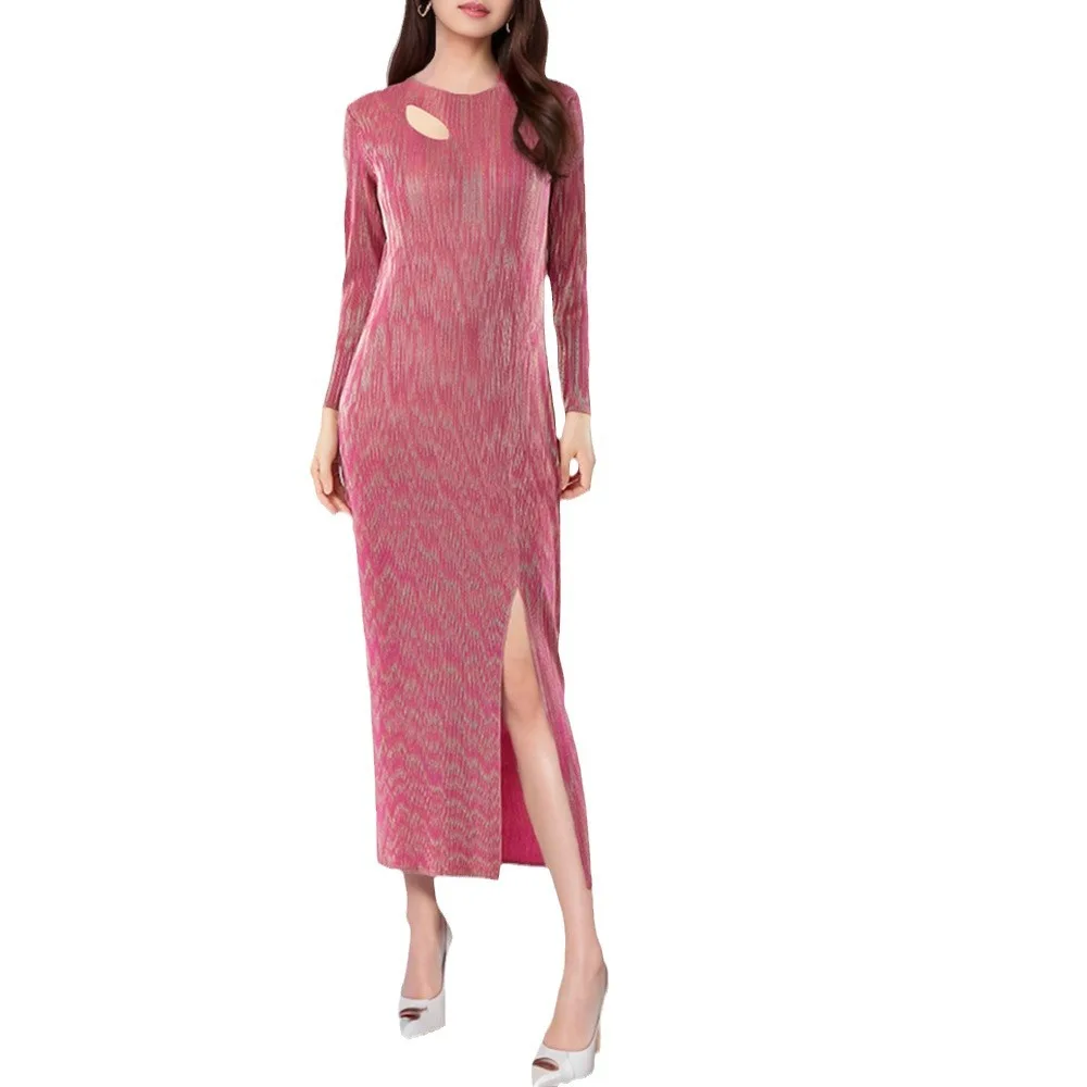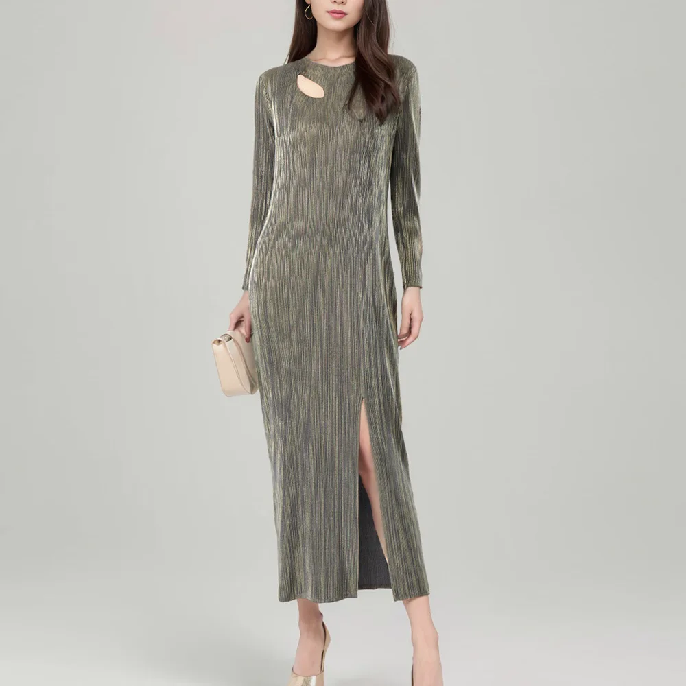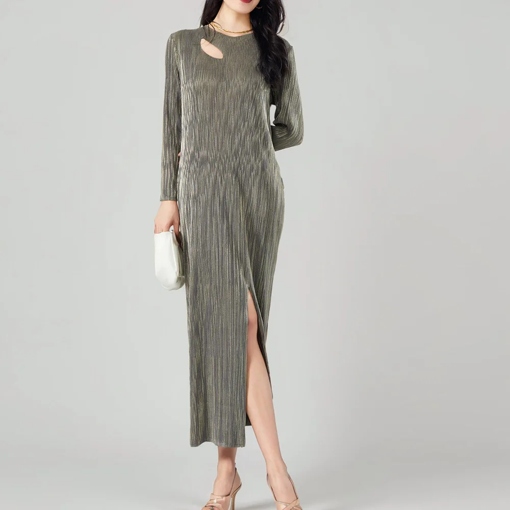 Latest Round Neck Miyake Pleated Long-sleeved Long Dress for Women With Slits Elegant Casual Pleated Dress