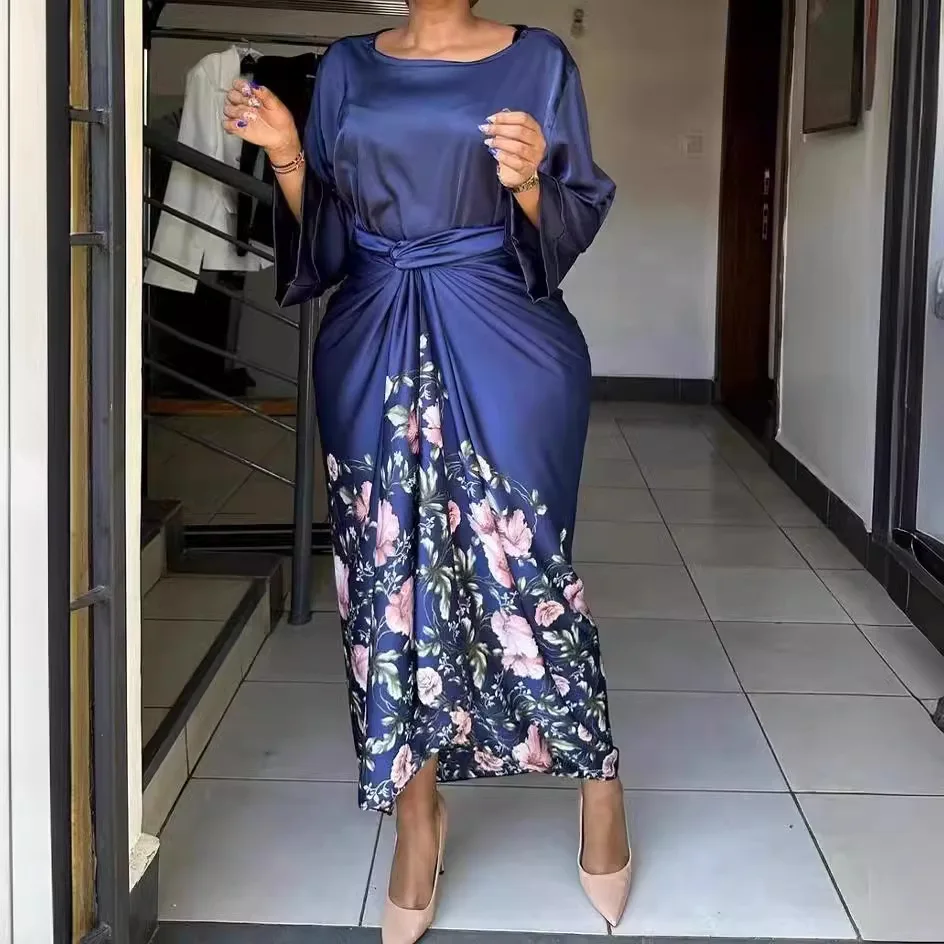 ZYHT 73963 Matte Satin Printed Geometric Pattern Maxi Women Asymmetric One Shoulder Ruched Hem Women Dress