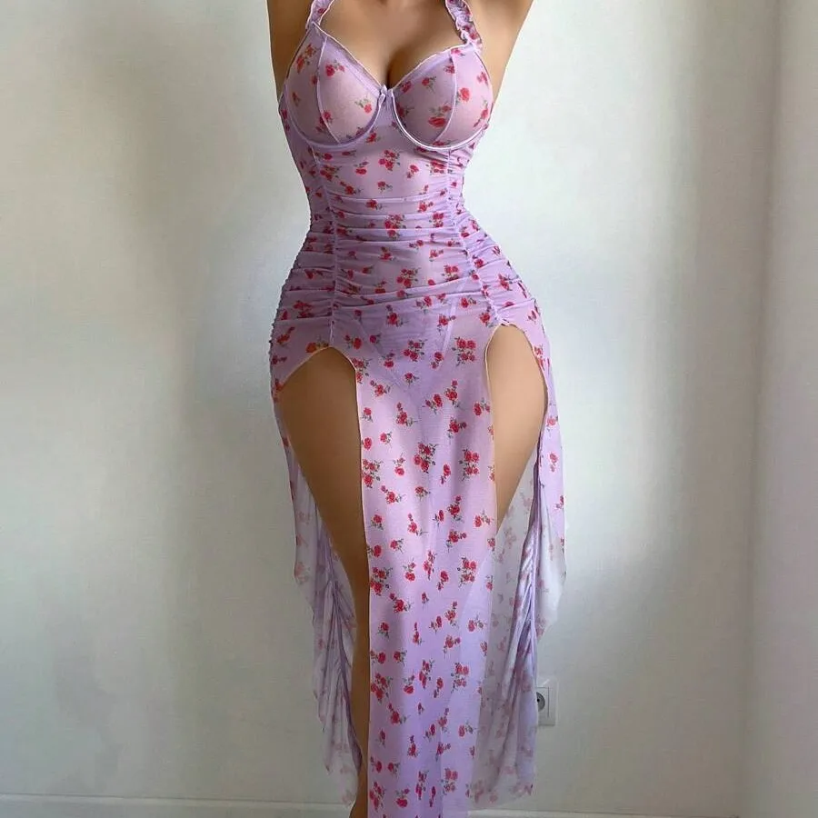 Women's Nightdress Mesh Print Split Fork Nightgown Pajamas Lingerie Dress Thong Two Piece Set