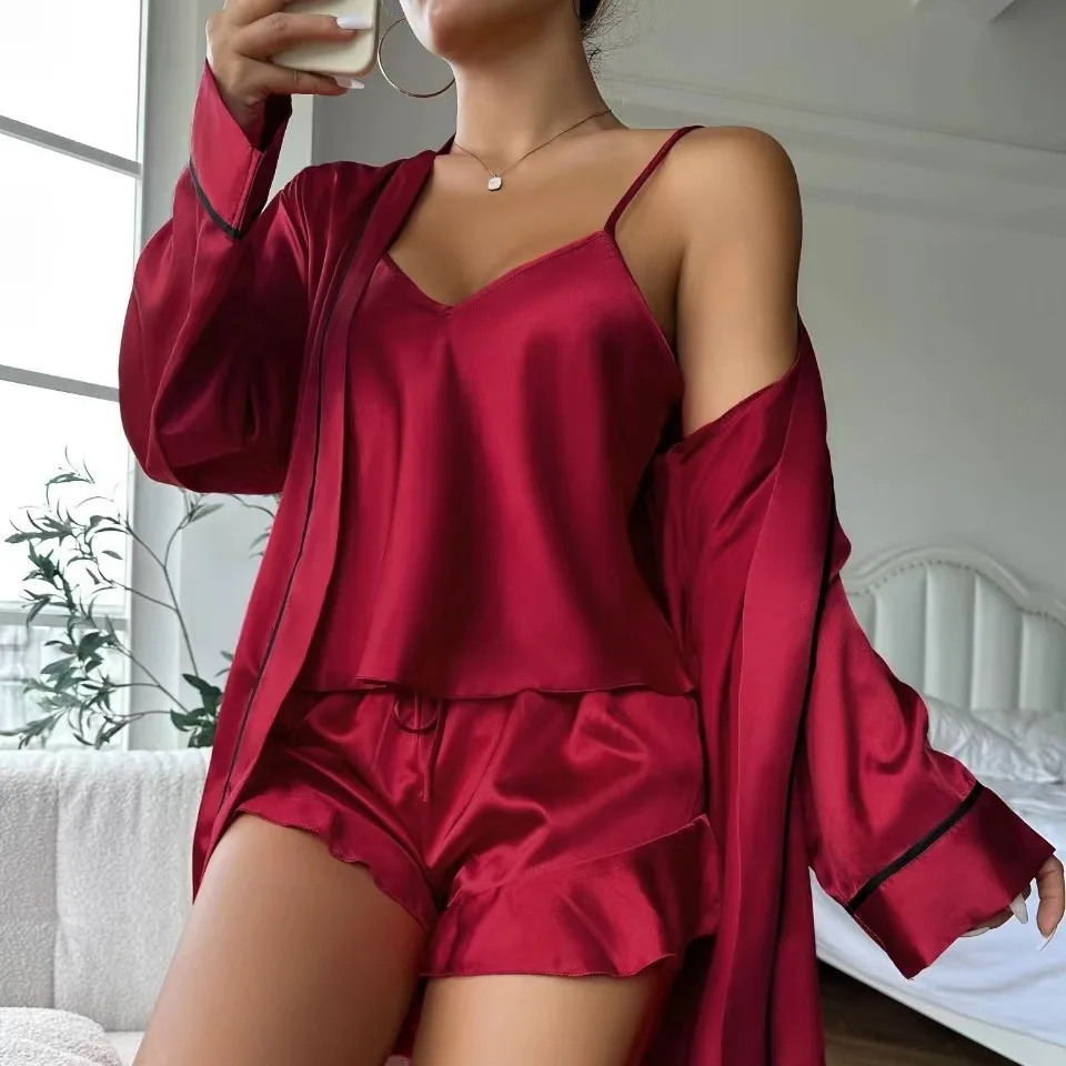 Popular Ice Silk Pajamas Women's Halter Shorts Nightgown Three-piece Sleepwear Summer Comfort Outside Home Wear