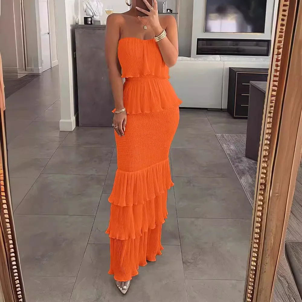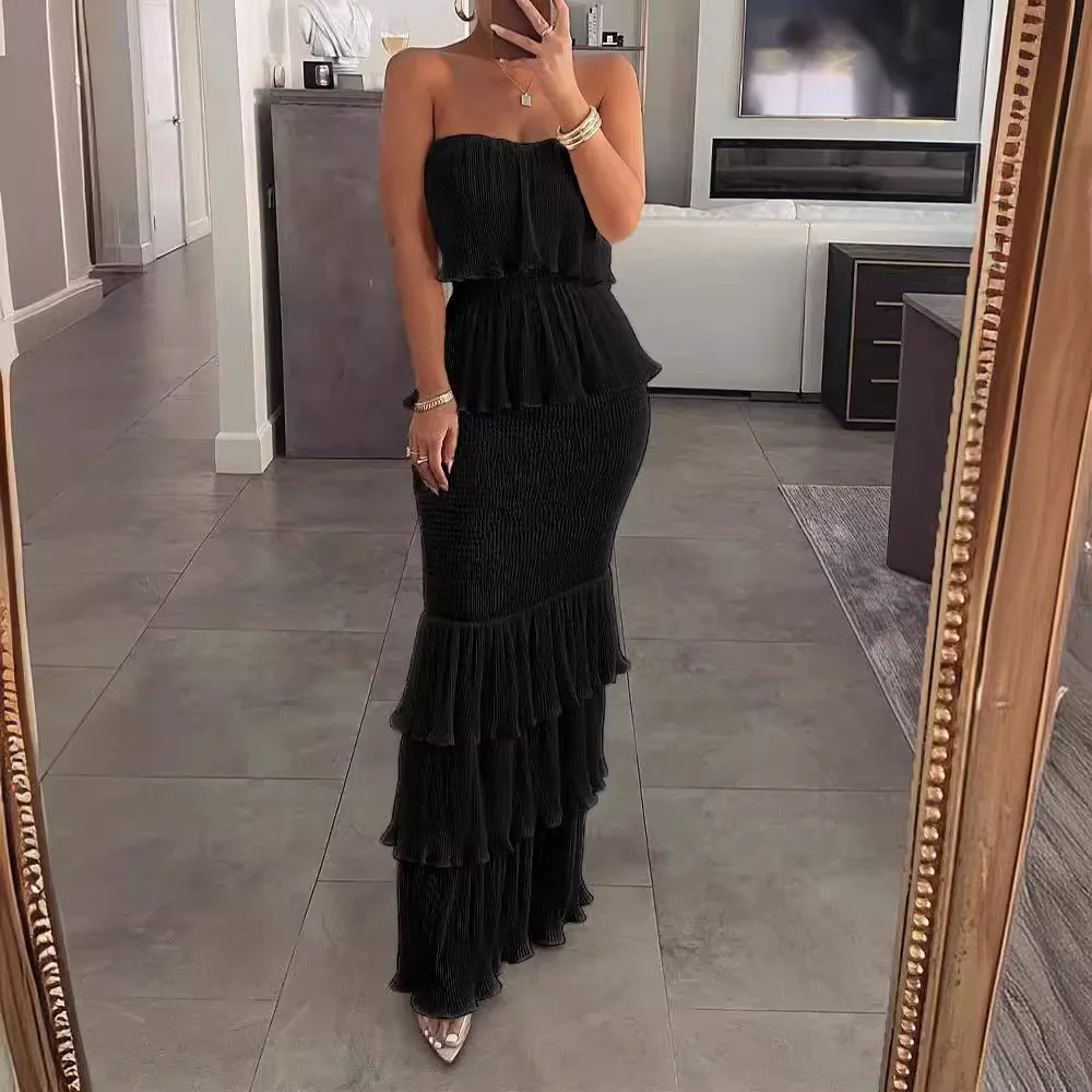 Women Fashion Bandeau Shirred Ruffle Hem Layered Dress Drop Shipping Wholesale Retail