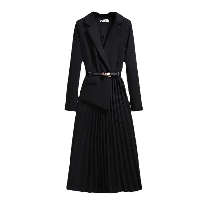 Fashion Formal Clothes Long Sleeve Pleated Suit Dress Solid Color Office Lady Professional Business Midi Long Casual Dresses