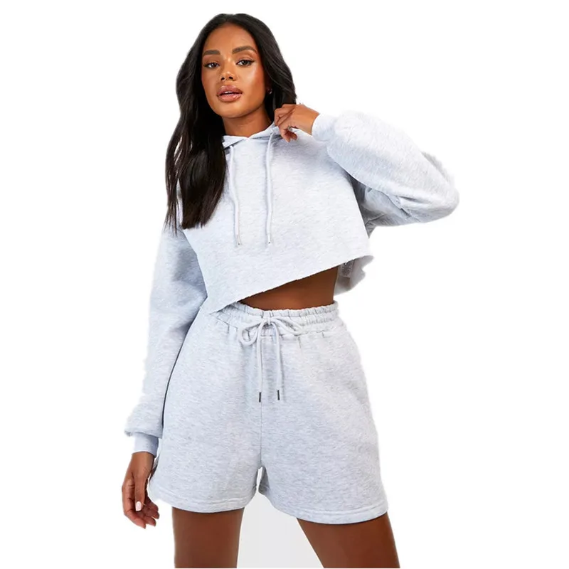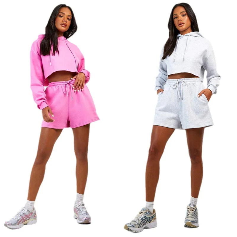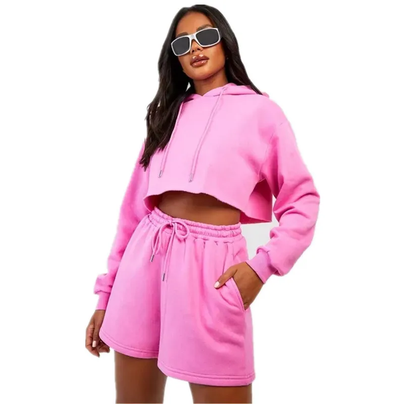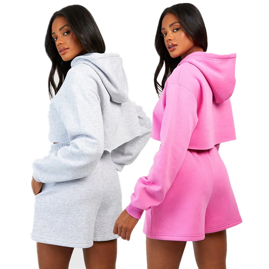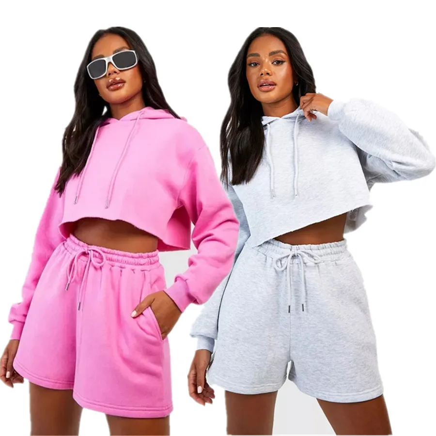 Wholesale Women's Custom Logo Two-Piece Casual Sports Hoodie Short-Length Trousers Cotton Suit for Women