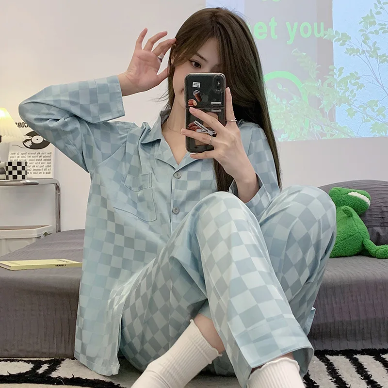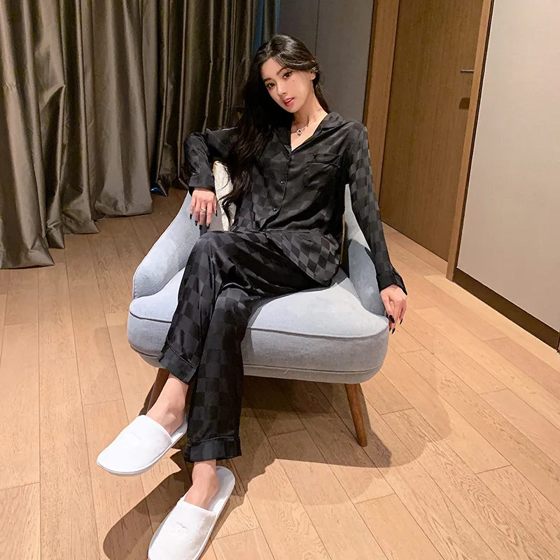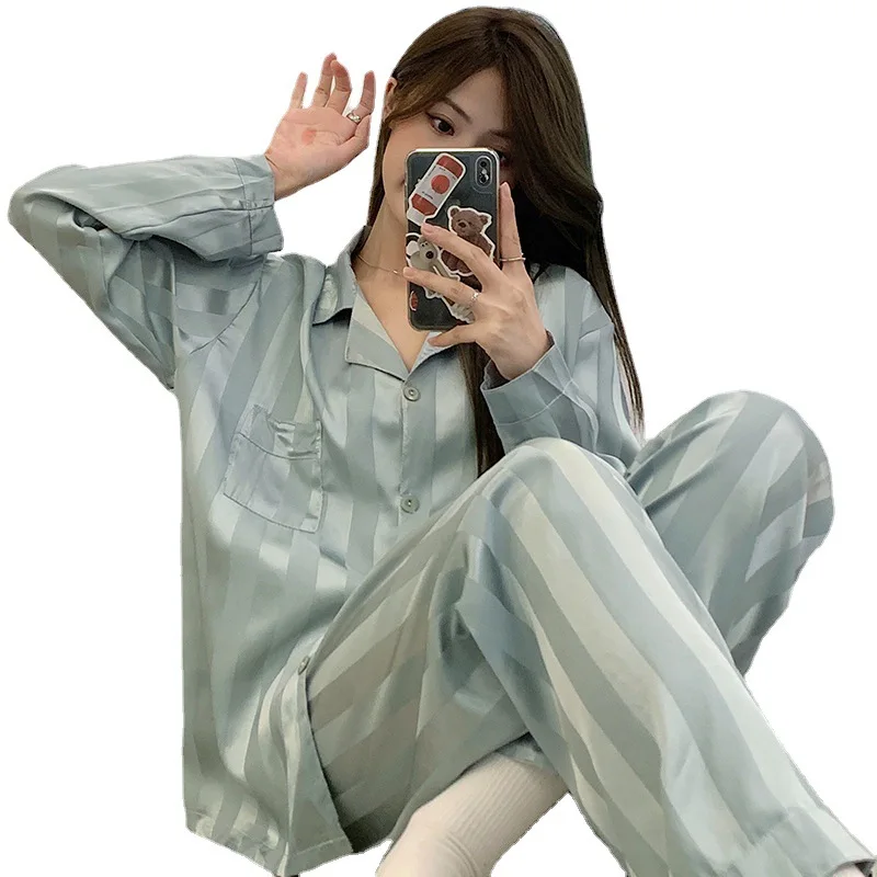 Women's Ice Silk Long Sleeve Pajamas Set Sexy Large Size Thin Home Clothes for Spring and Autumn
