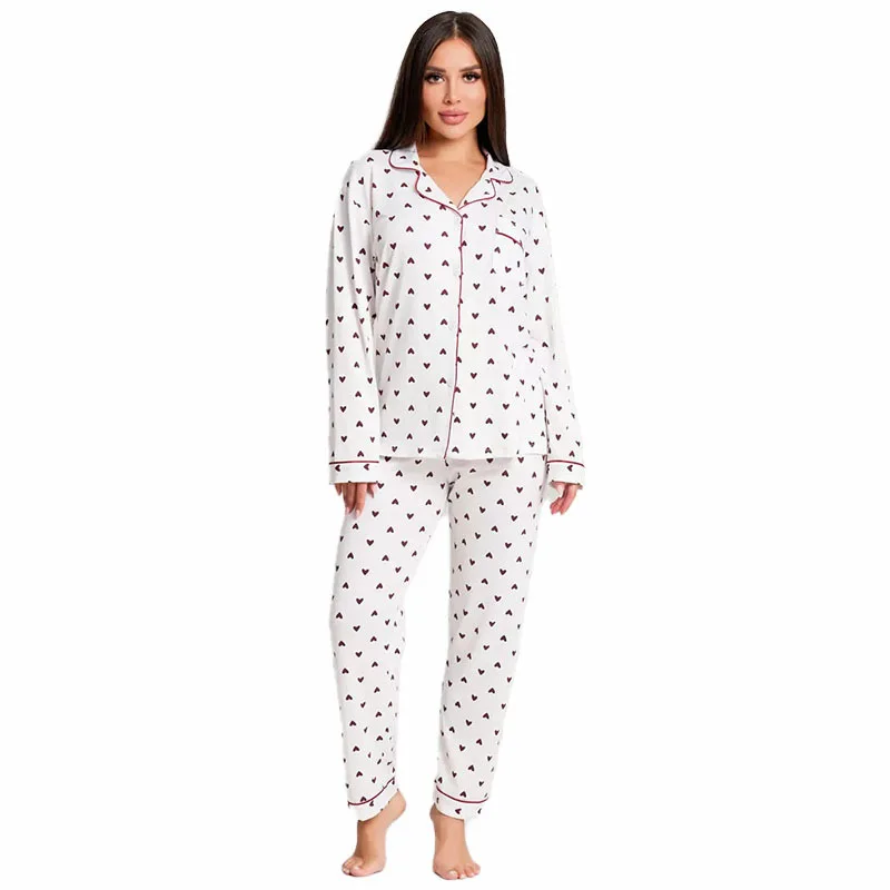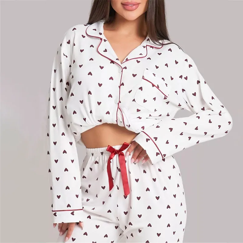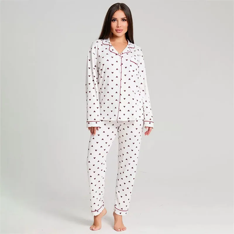 Hot Selling Women's Two-Piece Set Long Sleeved Thin Pants with Lapel Love Printed Casual Home Clothing for Spring Autumn