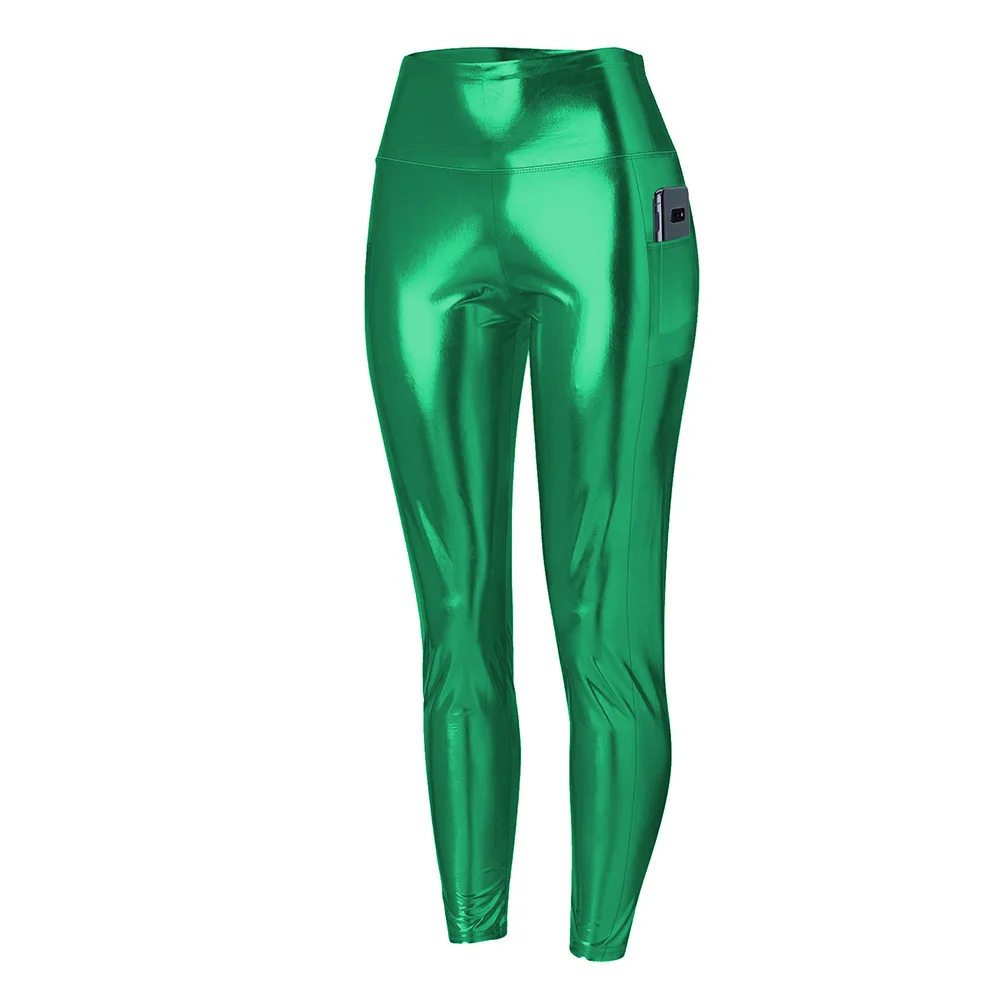 Metal Colored High Waisted Faux Leather Pants Fashionable Stage Party Bottom with Shiny Pockets Nine Point Thin Thickness