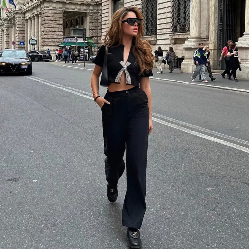 Women's Casual Solid Color Bow Blouse with Open Umbilical Waist New Fashion Everyday Street Short T-Shirt Button Decoration