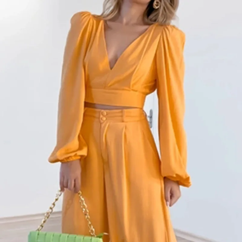 V-neck Long-sleeved Shirt High-waisted Wide-leg Trousers Large Size Fashion Casual 2 Piece Set Women Fall