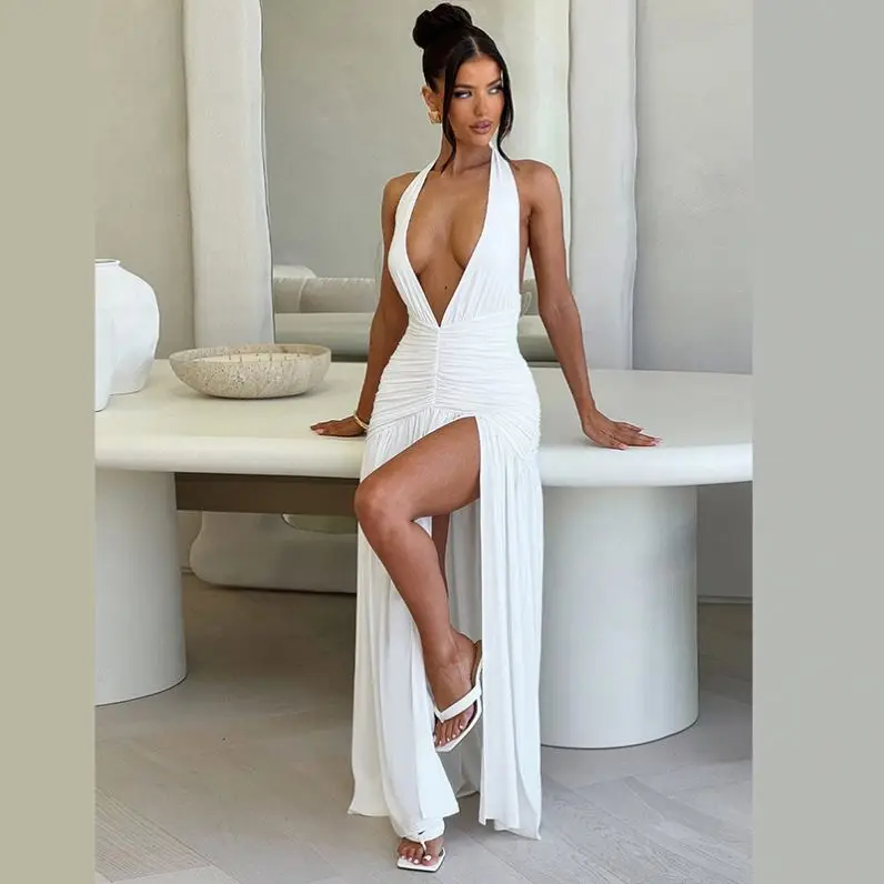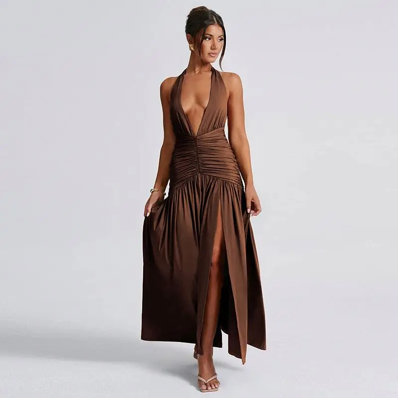 Women's Fashionable Elegant V Neck Halter Backless Pleated Sexy Slit Maxi Dress Dropshipping Solid Pattern Eco-Friendly