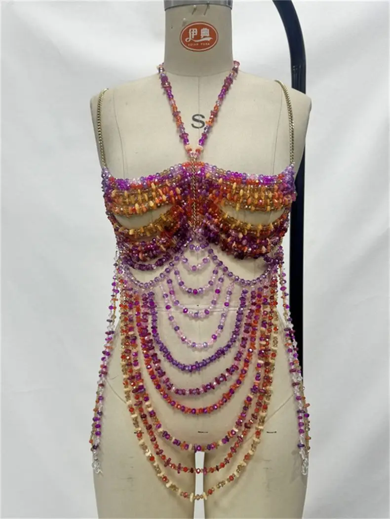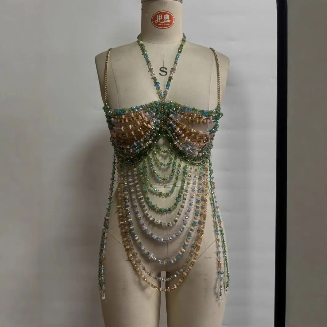 Dropshipping New Design Clothing Party Club Wear Shiny Bra Candy Color Beaded Top Body Chains Tank Top