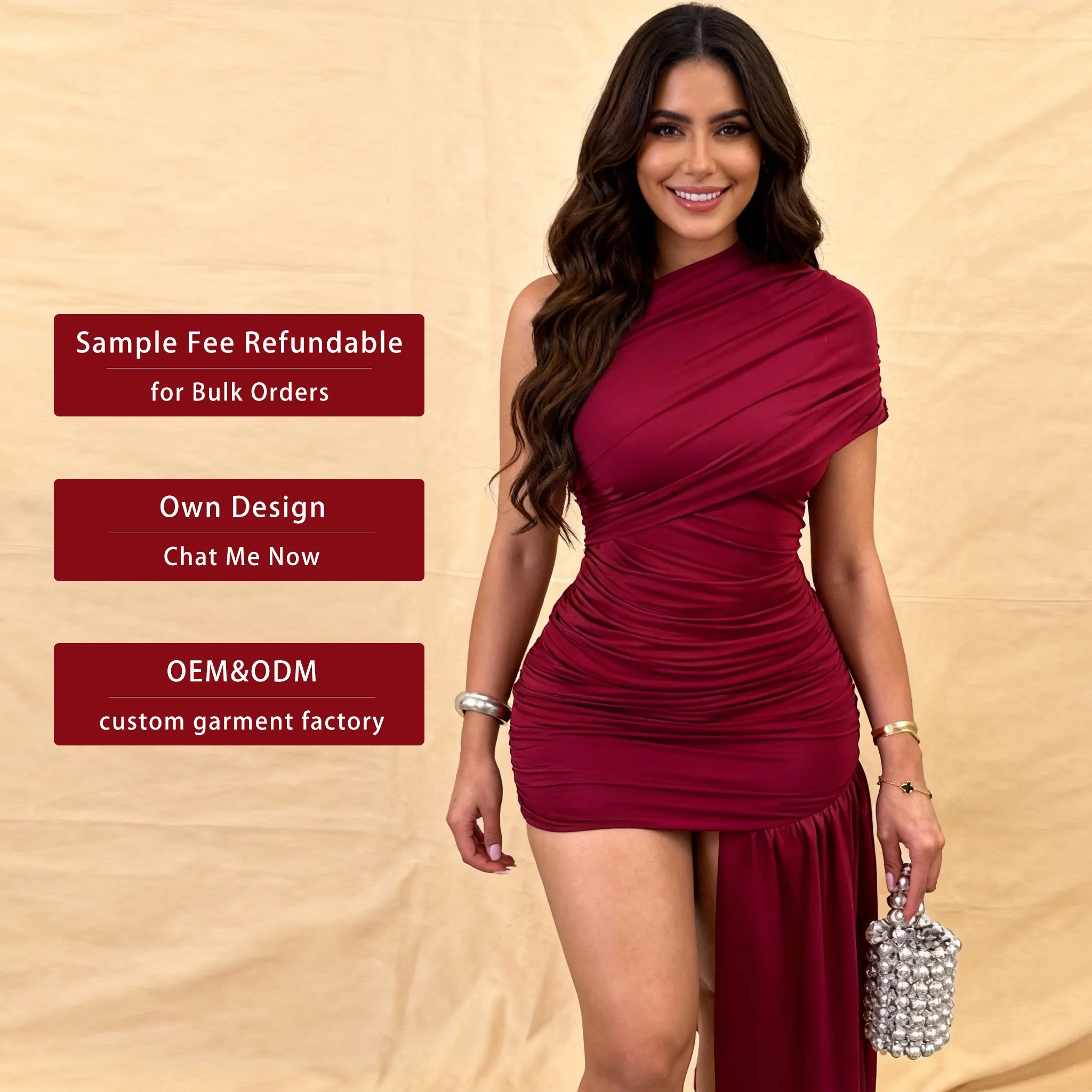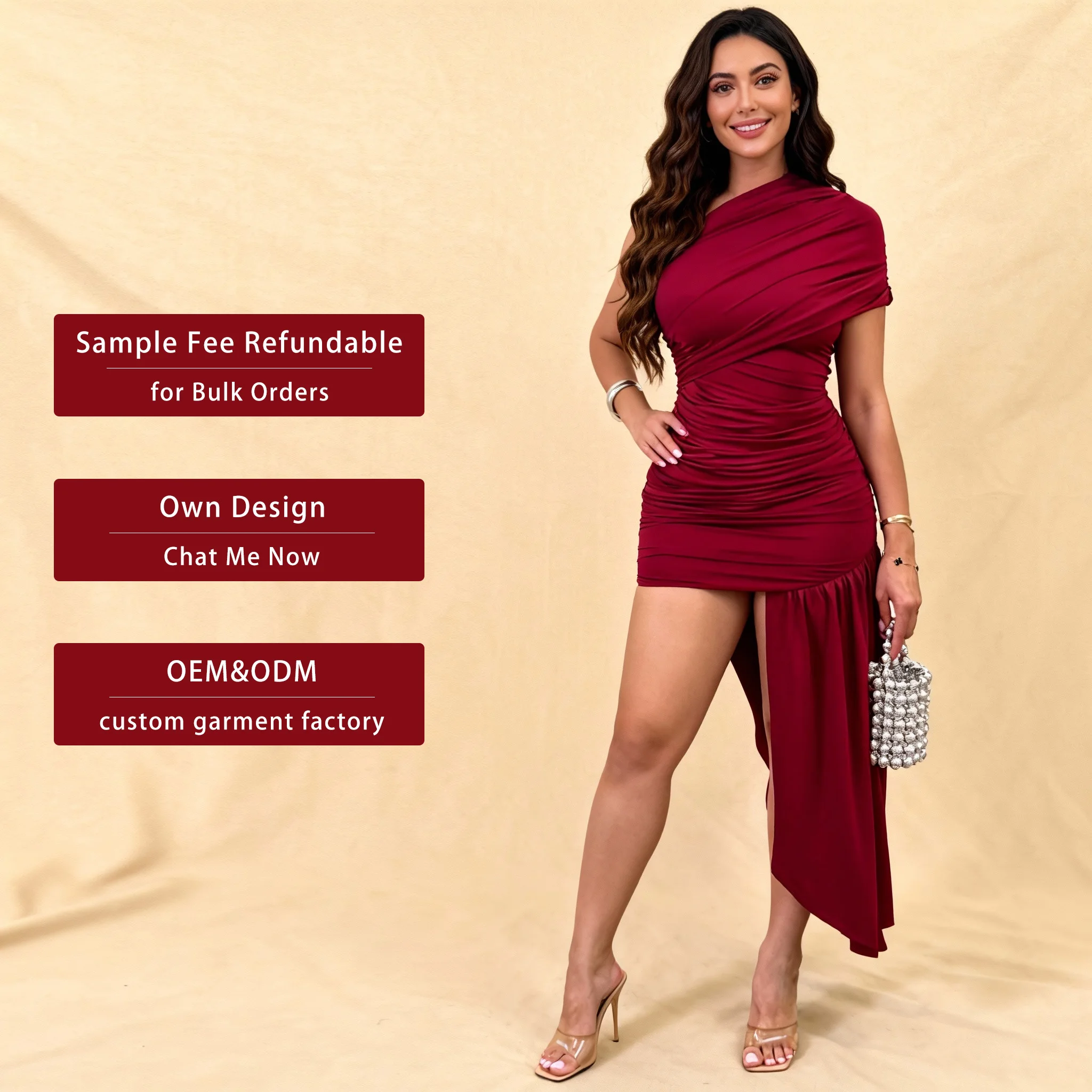 Wholesale Elegant One Shoulder Asymmetric Hem Party Dress Draped Bodice Design Slim Fit Sexy Ruched High-Low Mini Dress
