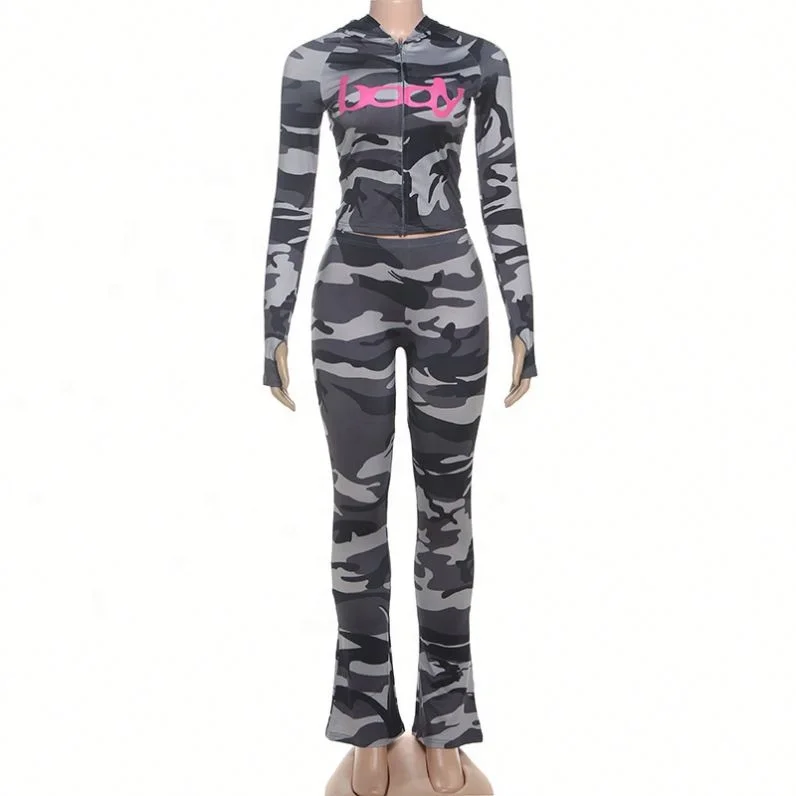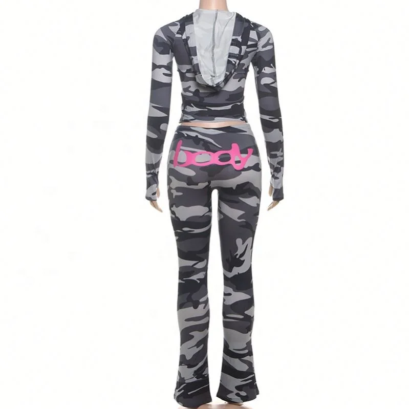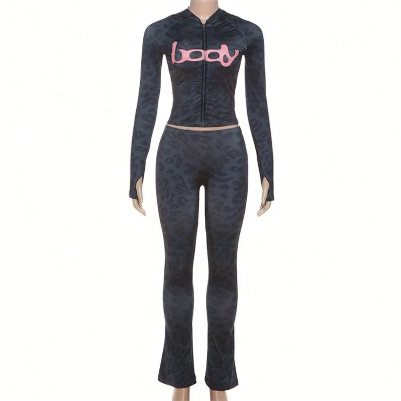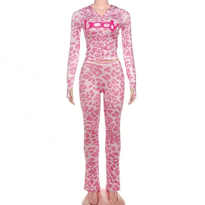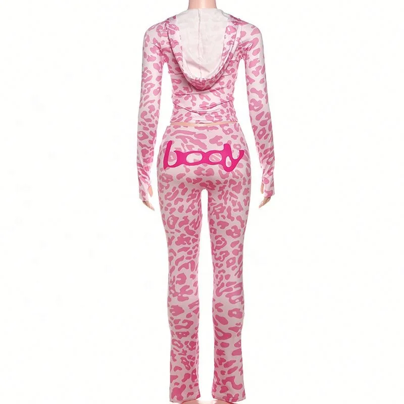 Dropshipping Wholesale Jogging Wear Leopard Print Two Piece Tracksuit Hoodie Women's Flare Pants Set