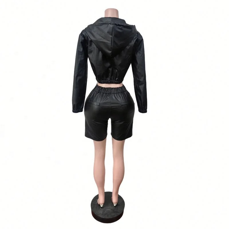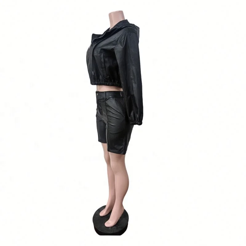 Dropshipping New Arrivals S-2XL 2026 Wholesale Autumn Fall Winter Pu Leather 2 Piece Shorts Set Women