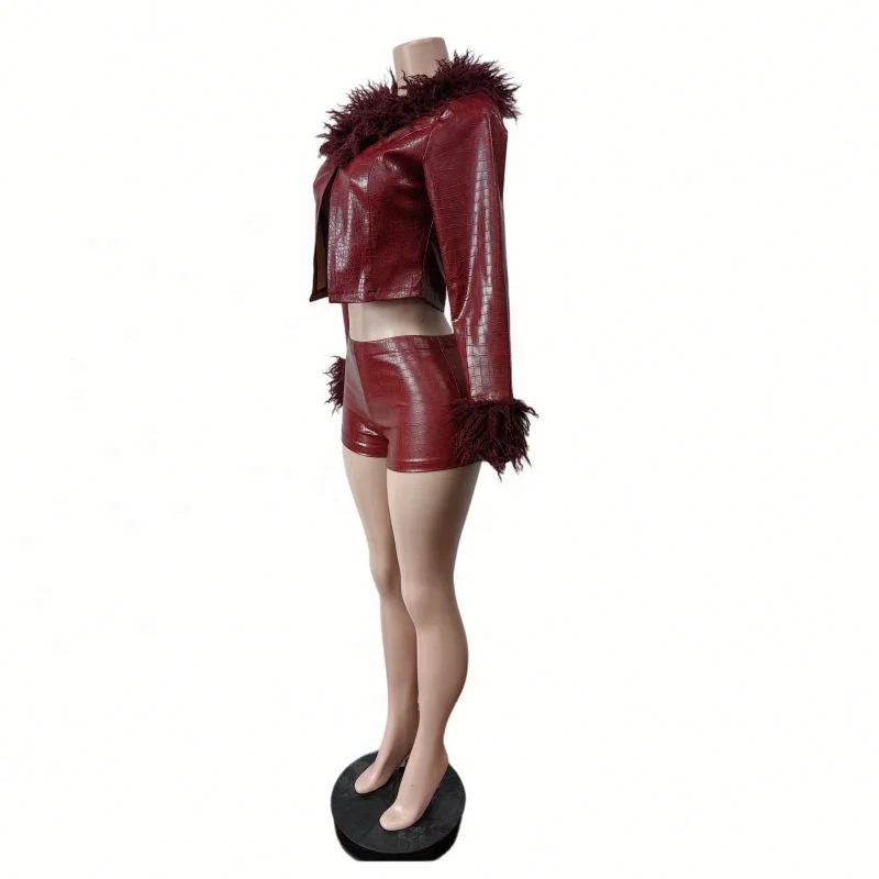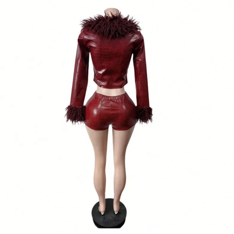 Dropshipping New Arrivals S-2XL 2026 Wholesale Autumn Fall Winter Pu Leather Furs Shorts Set Women