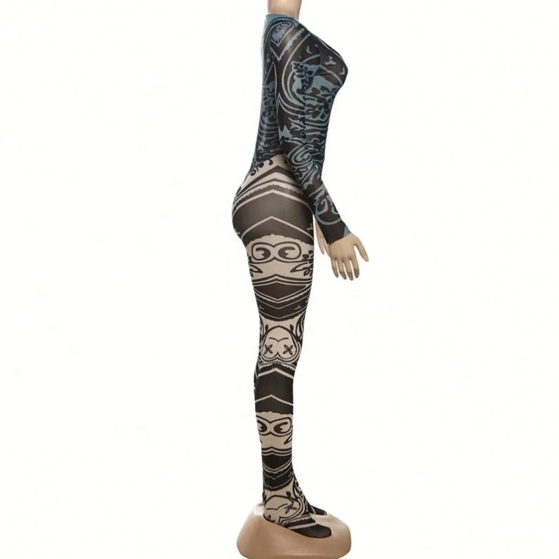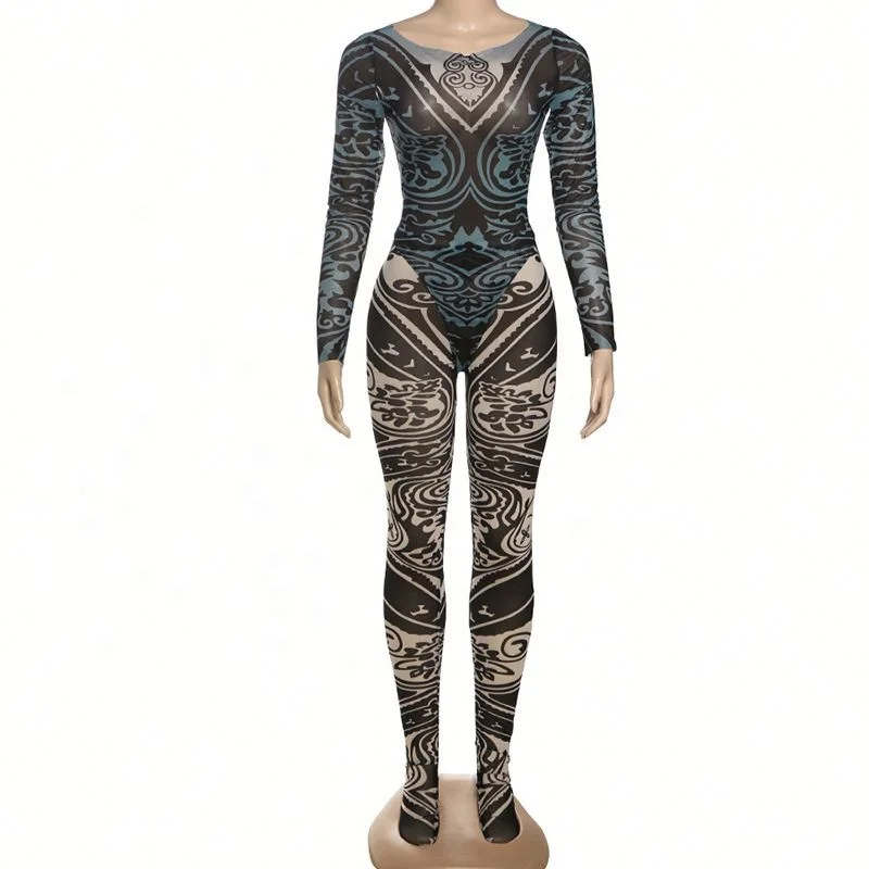 Dropshipping 2026 Wholesale Boutique Long Sleeve Digital Print Mesh Ladies Two Piece Romper and Pants Set