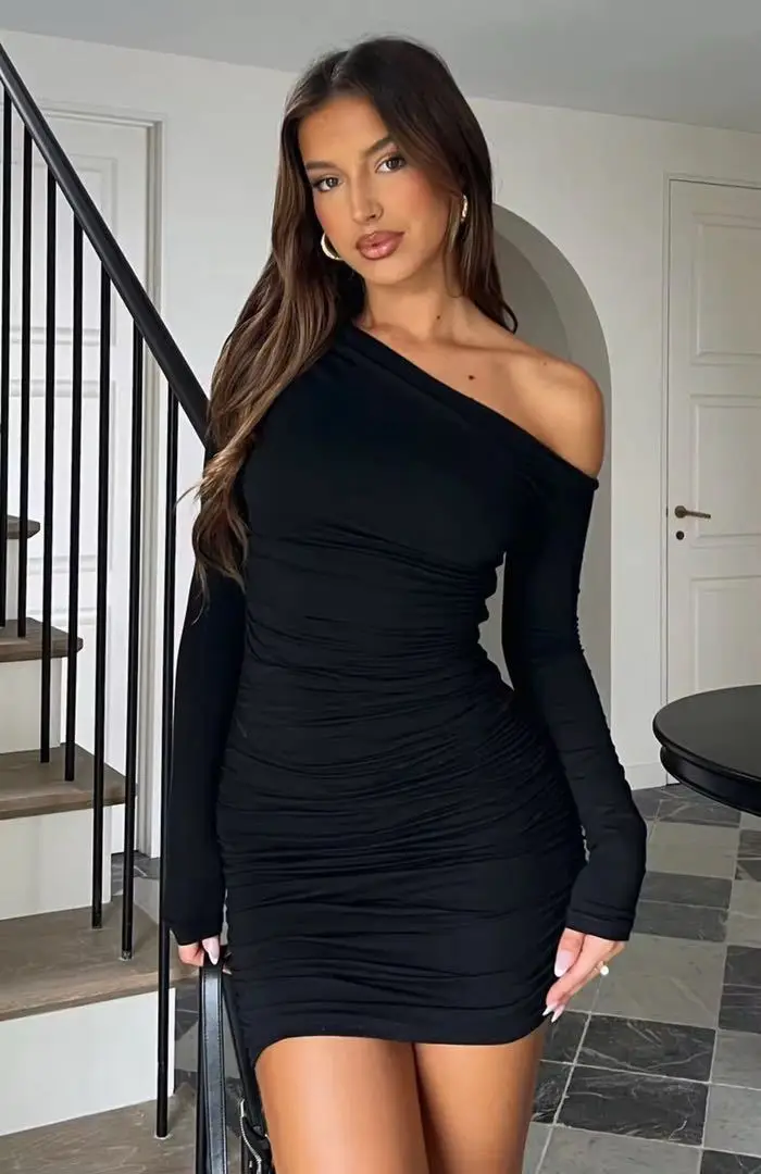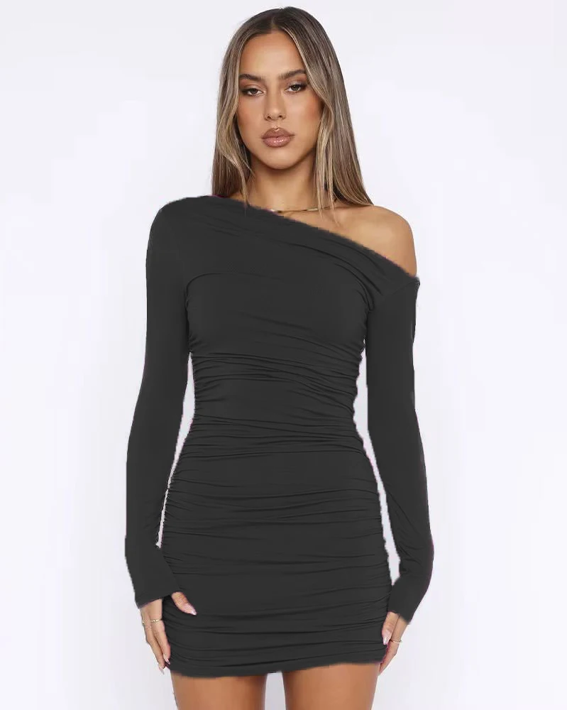 2026 Spring Solid Asymmetrical Neck Women Dress Sexy Long Sleeve Off Shoulder Pleated Wrapped Bodycon Dress Women Mini Dress