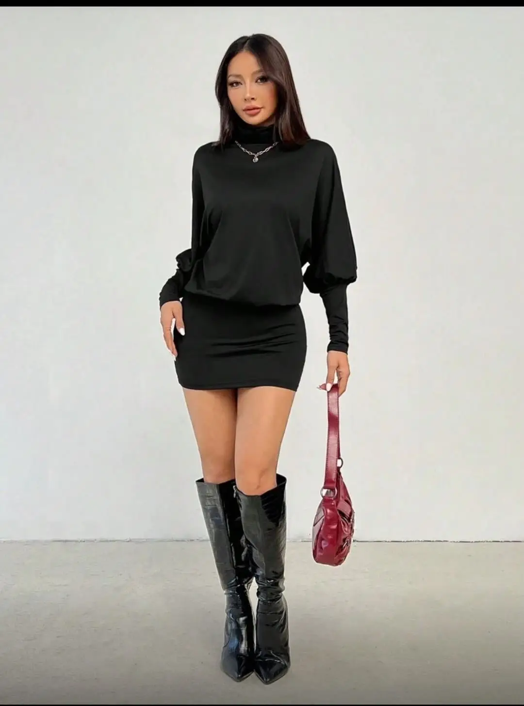 ZYHT 21938 Black Velvet Mini Dress Square Neck Long Puff Sleeves with Pearl Trim & Crystal Dess Flared Scalloped Hem Dresses