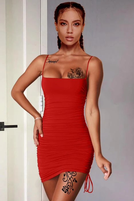 New Spaghetti Strap Ruched Backless Bodycon Drawstring Knitted Party Dresses Women Sexy
