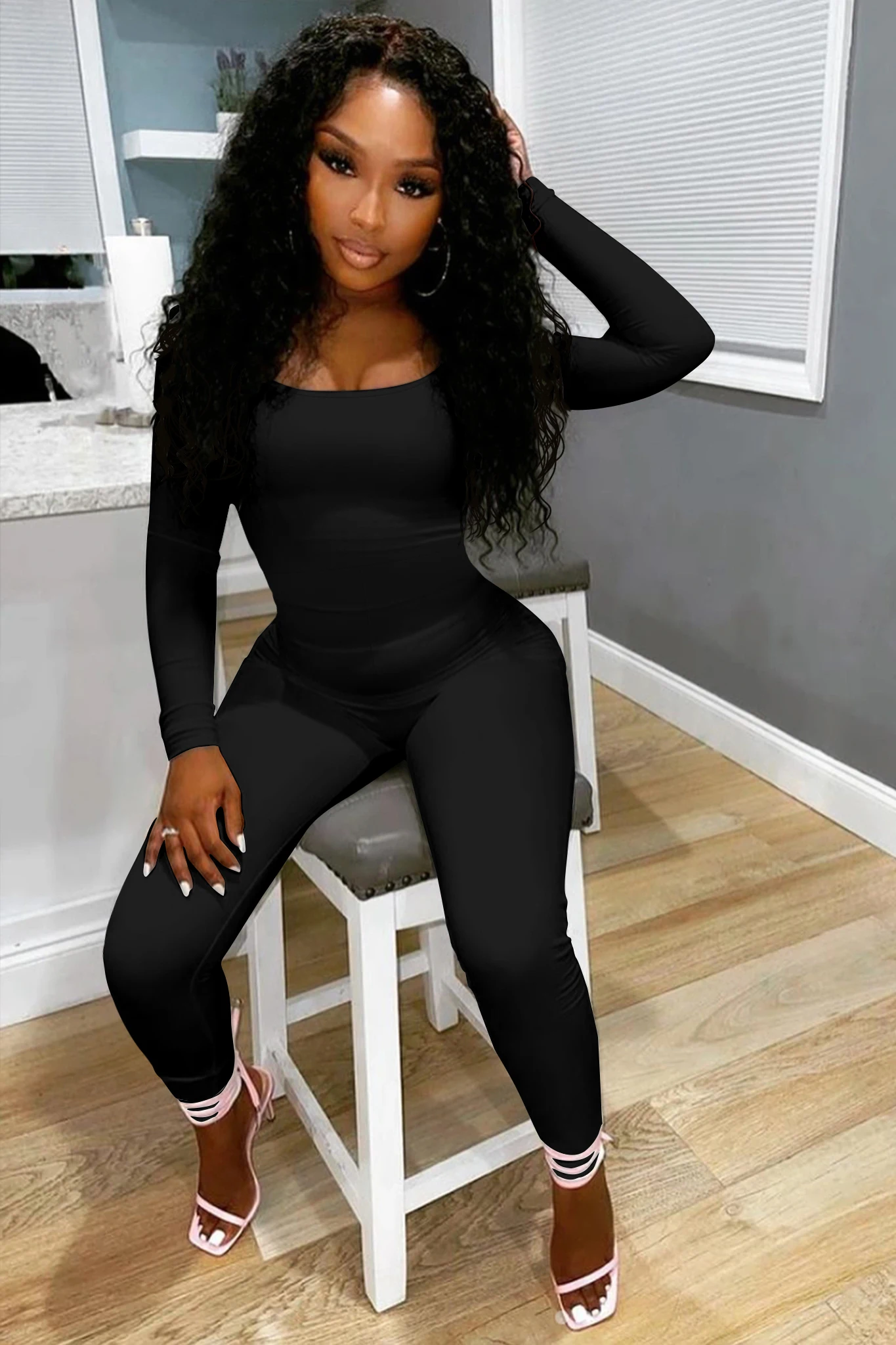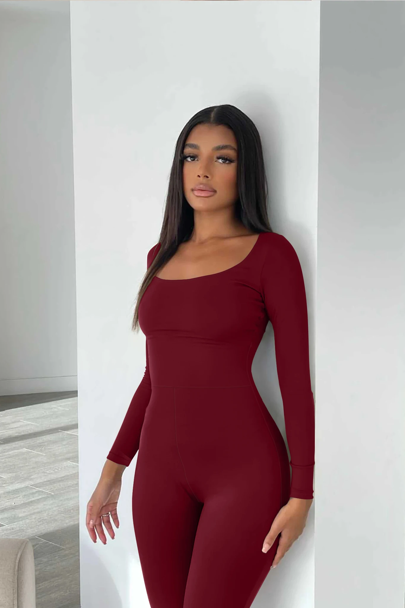 Unique Design Solid Long Sleeve square Collar Backless Bodycon Sexy Jumpsuits for Women