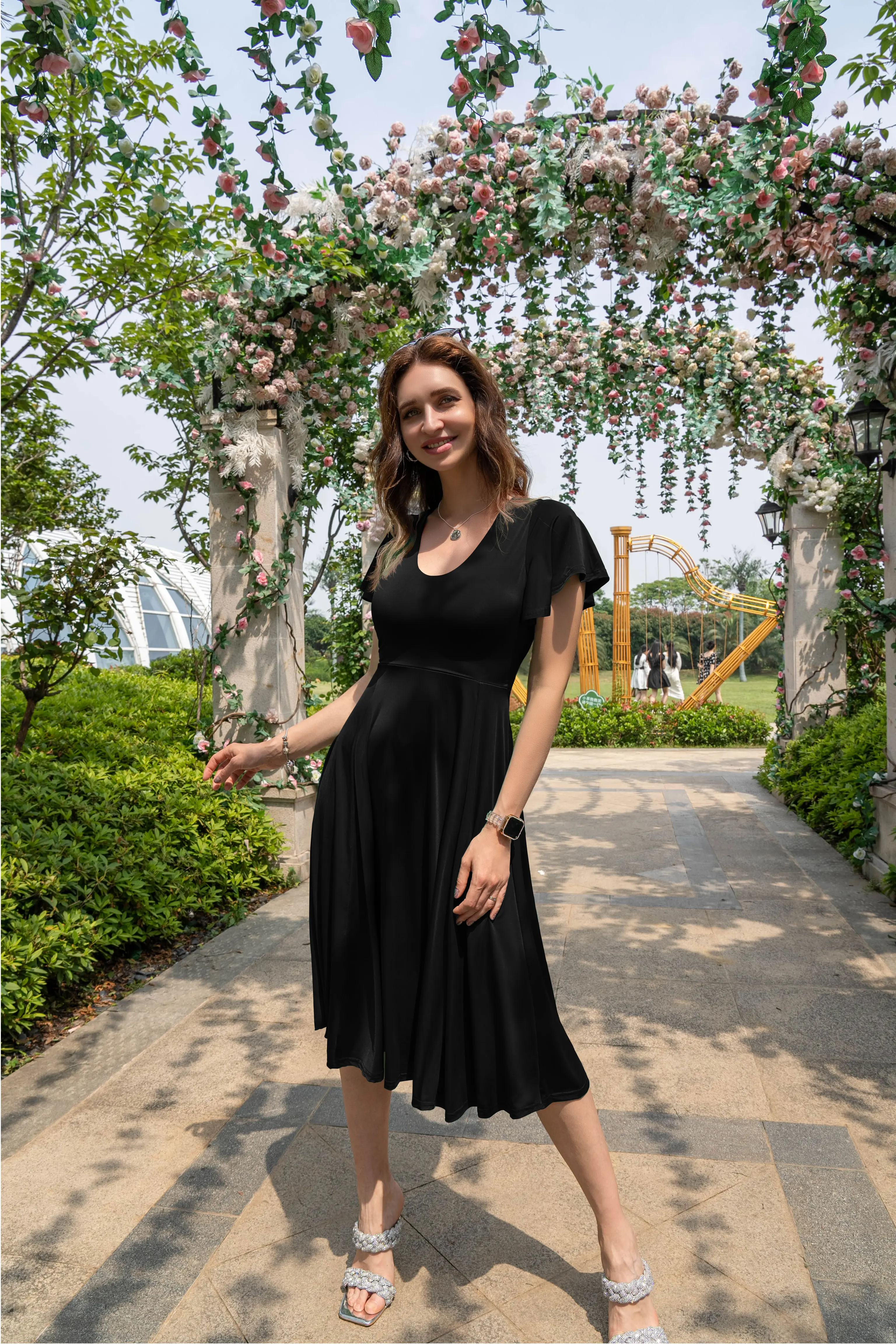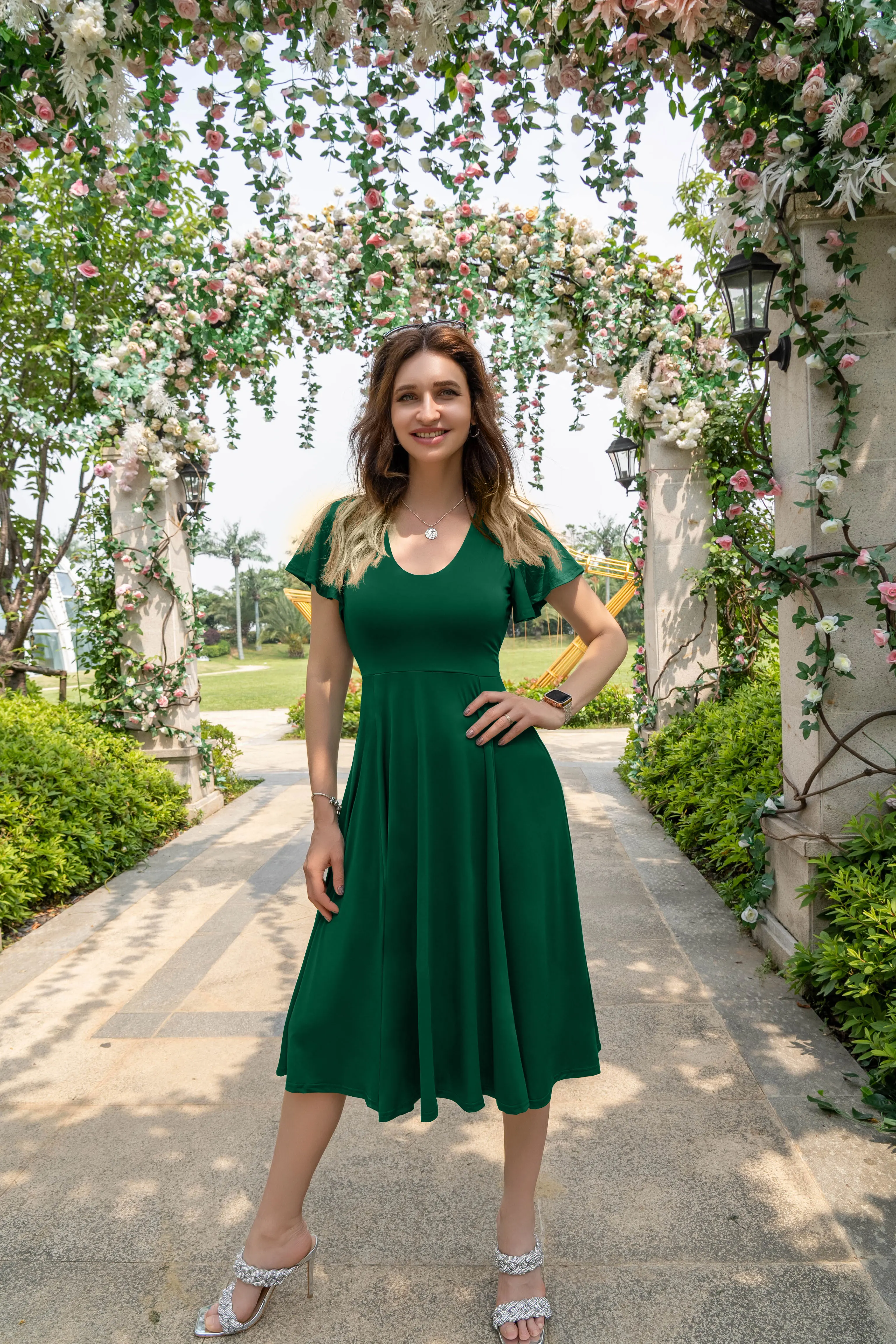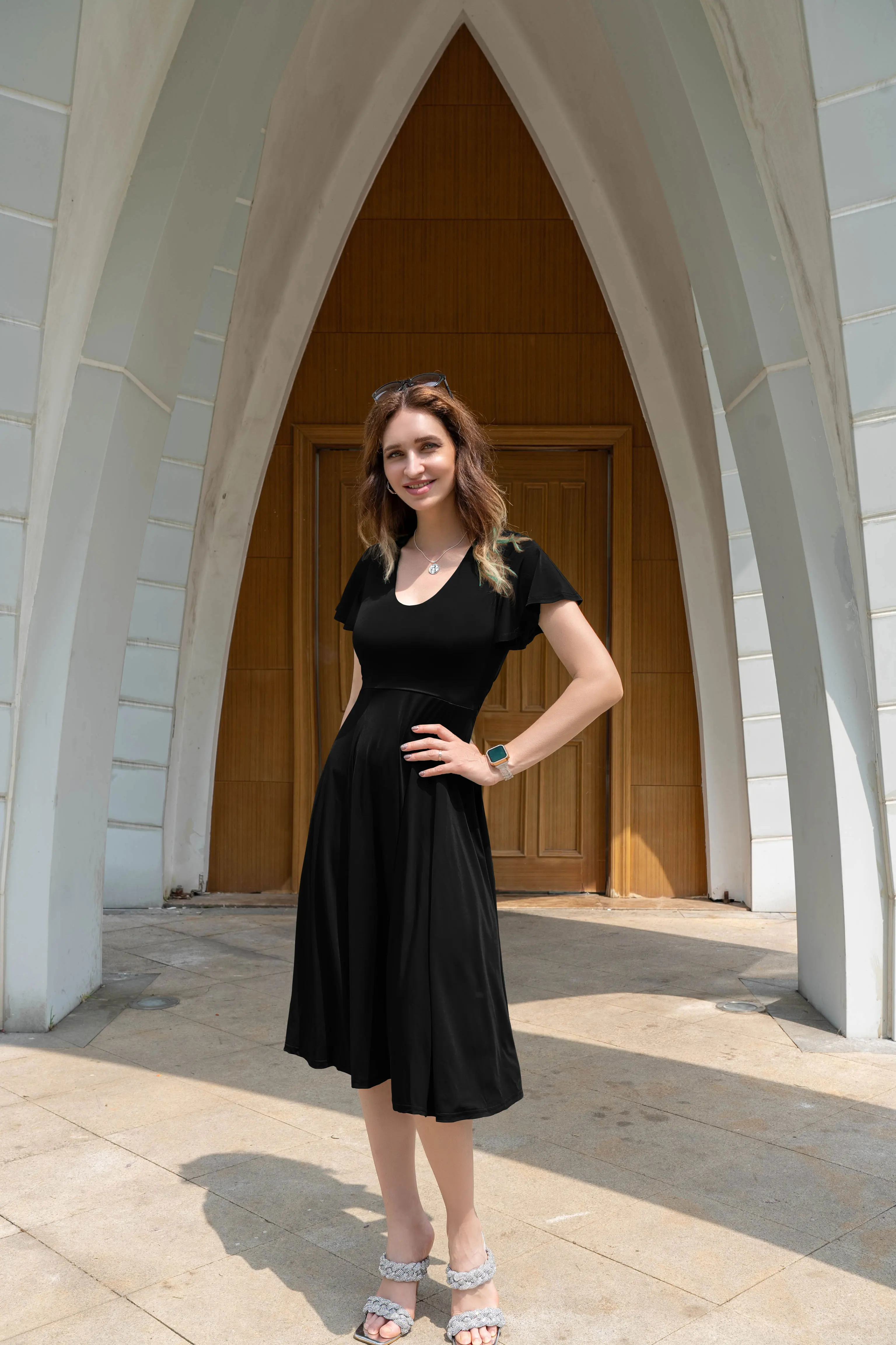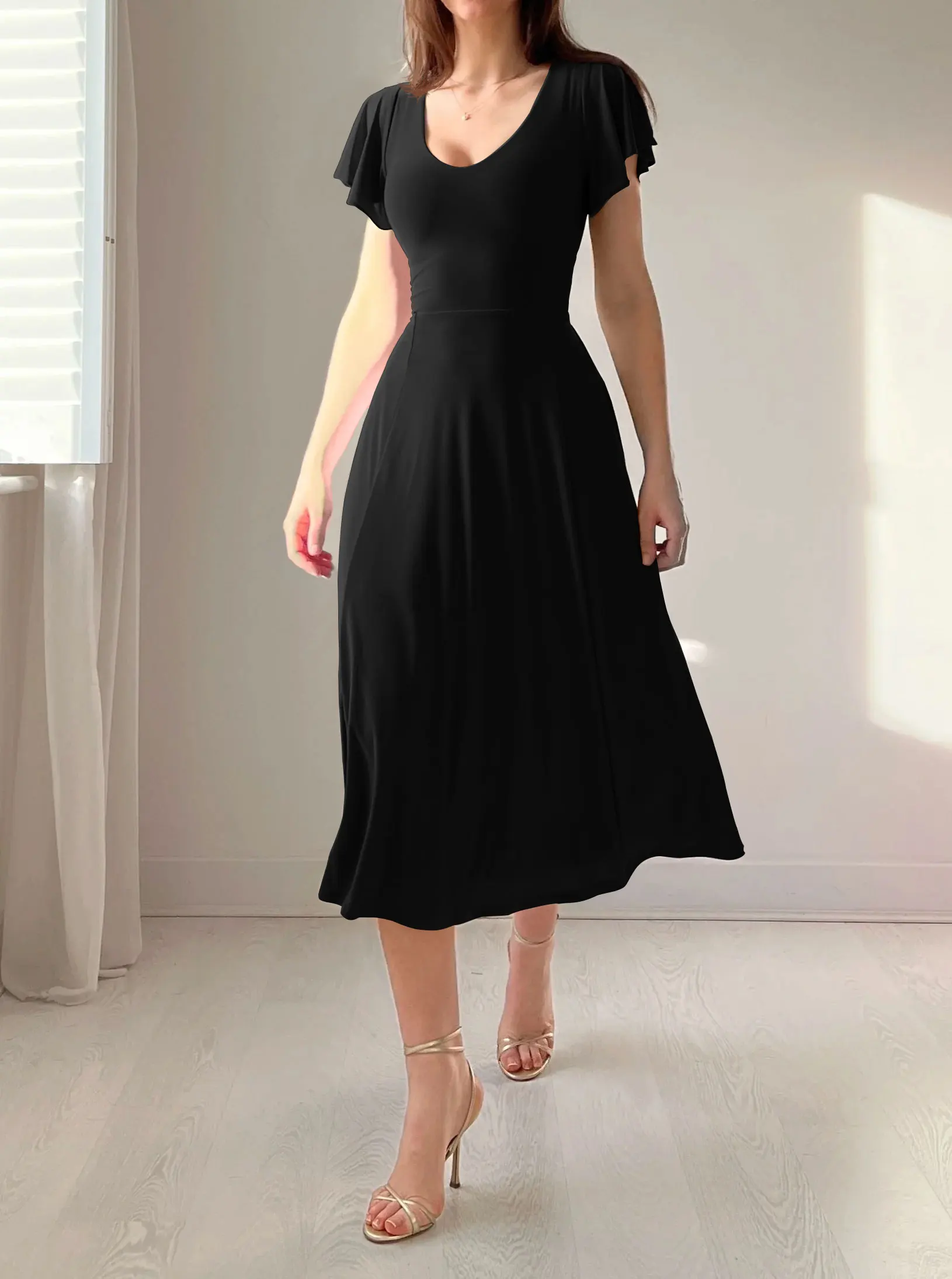 Custom Lady Womens Clothing U Collar Ruffles Sleeve Slim Pleated Casual Long Dress for Party