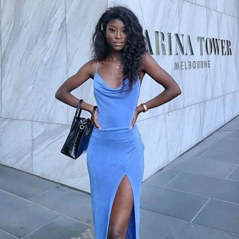 New Fashion Summer Split Ruched Sleeveless Backless Spaghetti Straps Midi Ladies Wear Dress