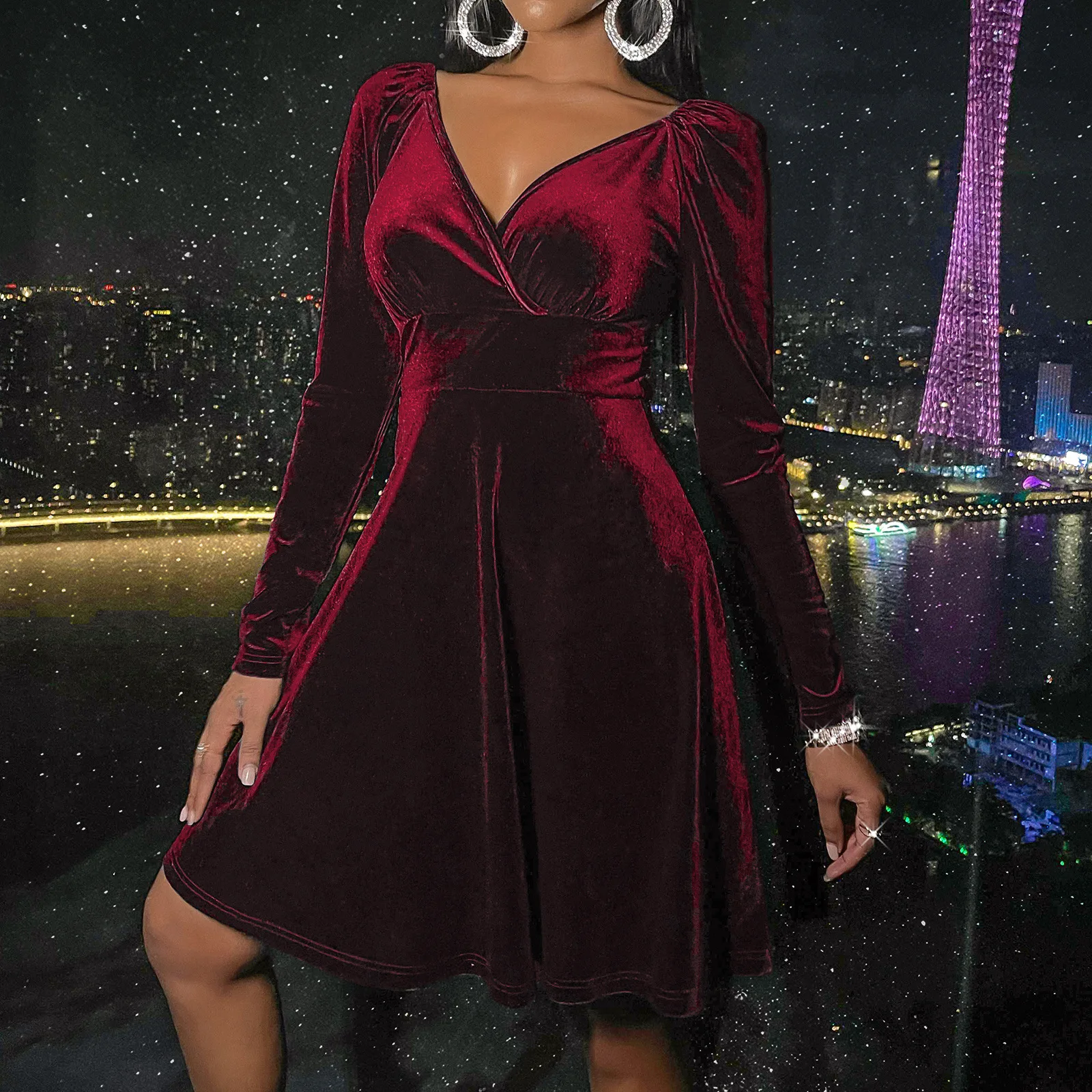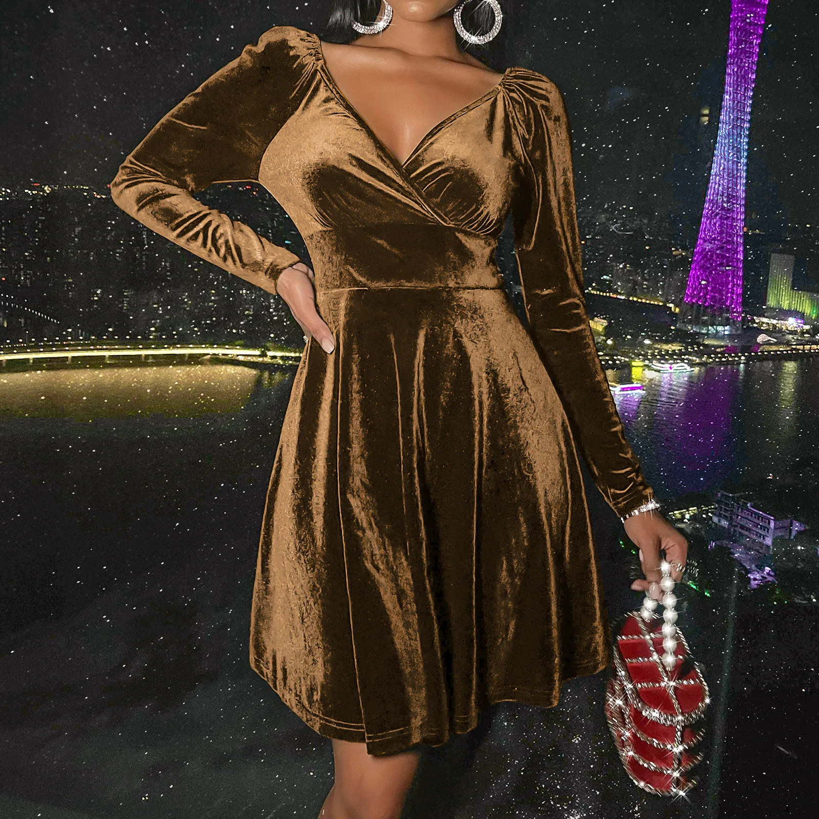 New Arrival Women Autumn Sexy V Neck Long Sleeve Elegant Velvet Ladies Wear Dress