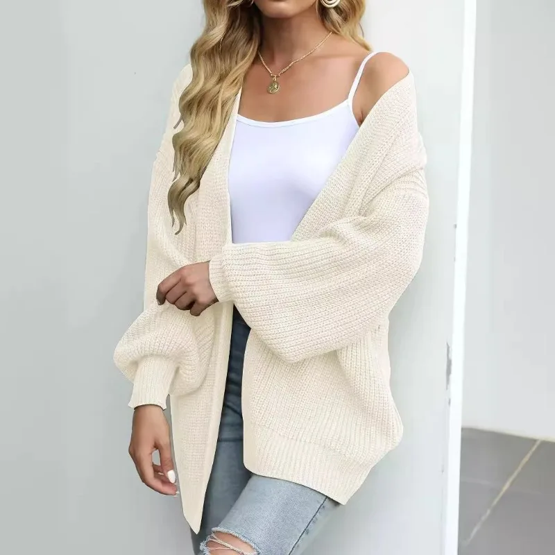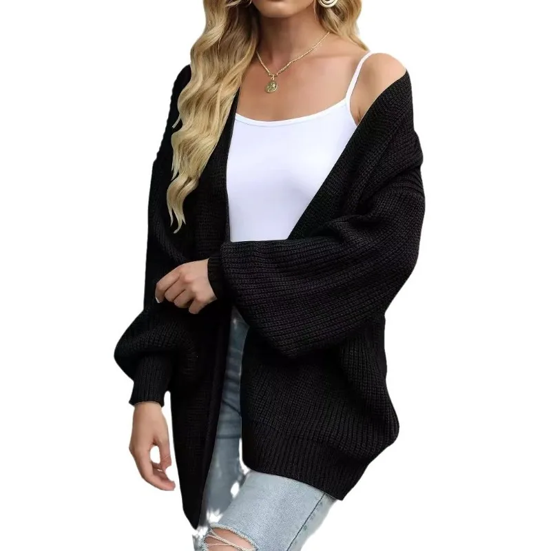 Good Quality Embossed Logo Cardigan Casual Style Women's Puff Sleeve Knitted Sweater with Pocket for Winter