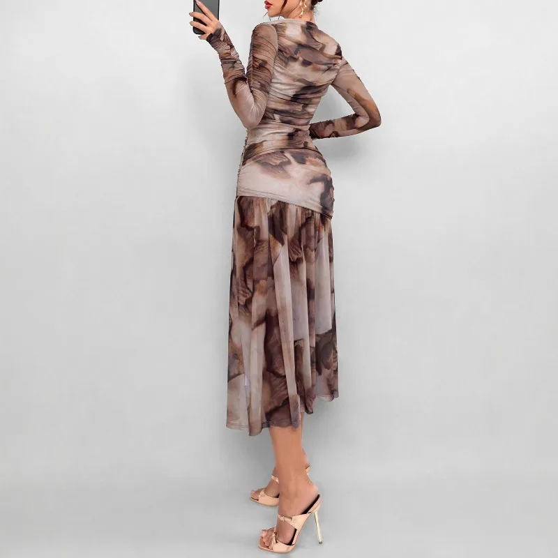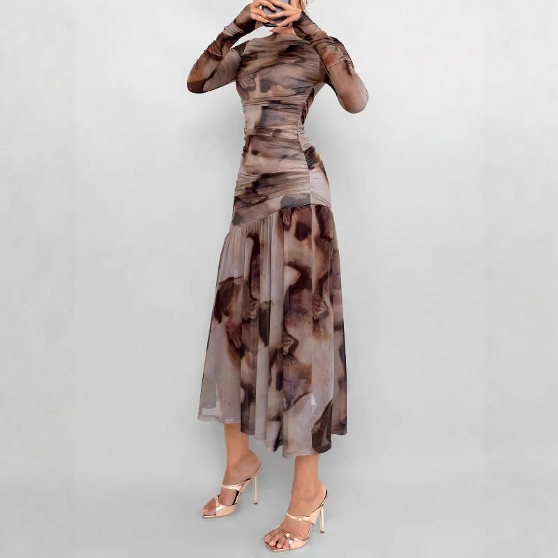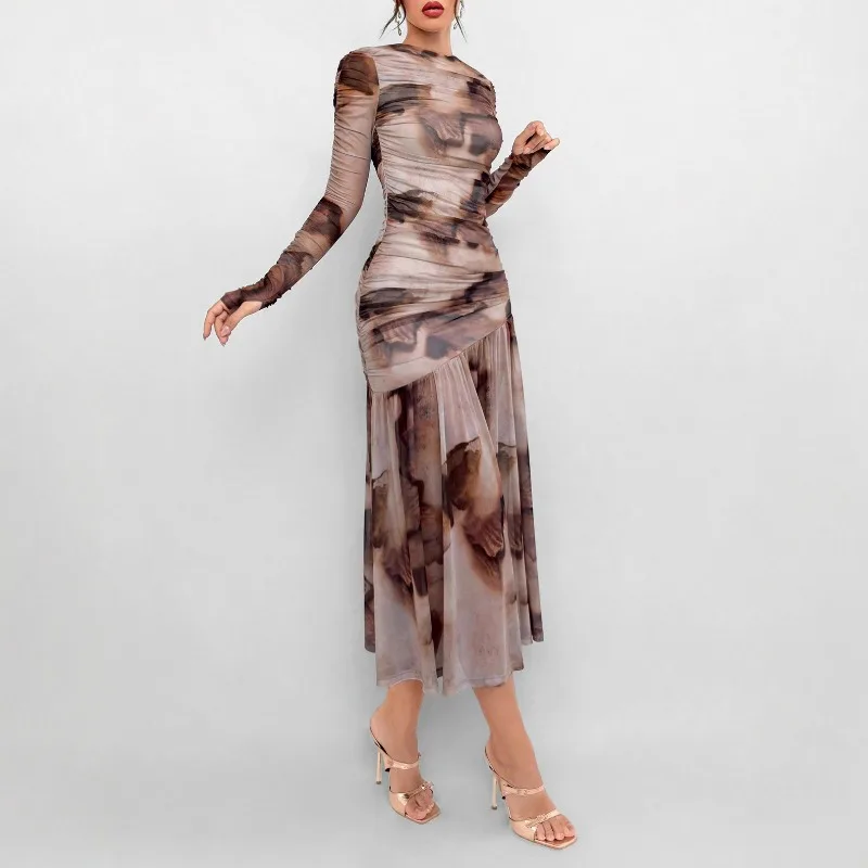 Mesh Summer Dress Long Sleeve Printed Clothing Shirring Women Midi Dress Vestidos