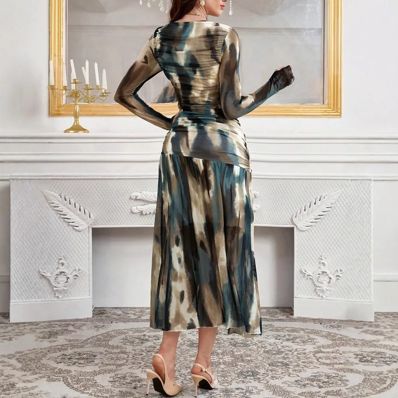 3D Print Dress Pleated Long Sleeved Mesh Dress for Women Thumb Hole Midi Dresses Vestidos
