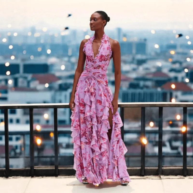 Backless Sexy Floral Print Night Dress Stack Ruffle Summer Dresses for Plus Size Organic Floral Printed Fabric for Garment Dress