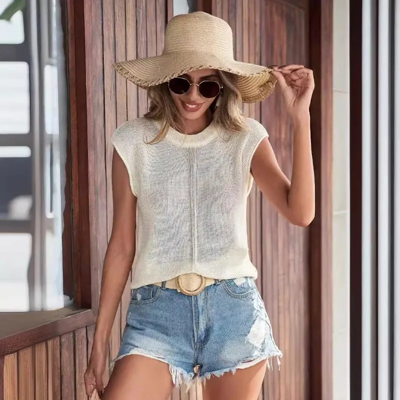Women's Casual Round-Neck Knit Tops Lightweight Summer Sweater Vest Solid Pattern O-Neck Design for Vacation Style