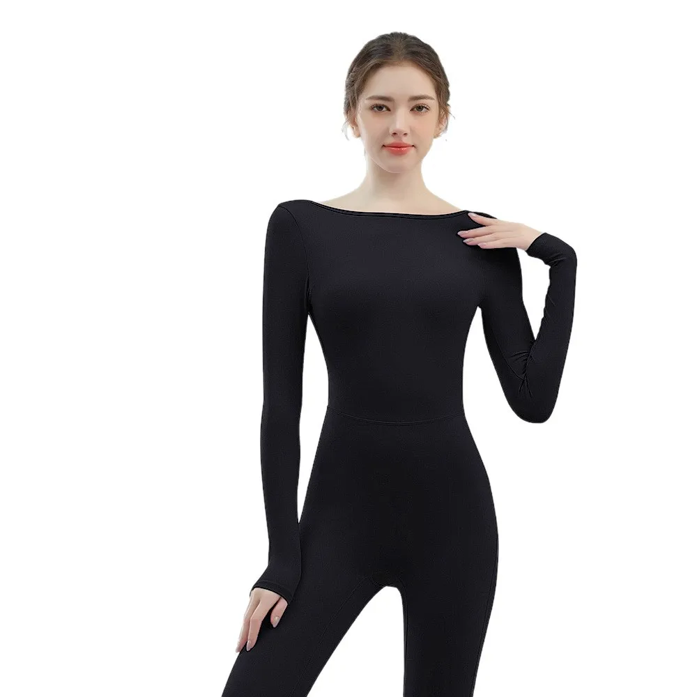 Women's Deep U Backless Long Sleeve Yoga Bodysuit, Slim Fit Sexy Pilates Gym Workout Activewear with Built-in Bra